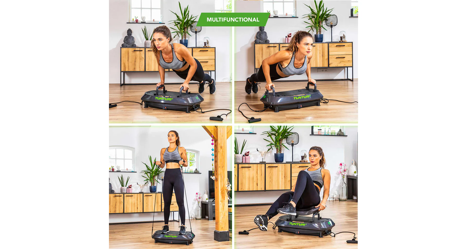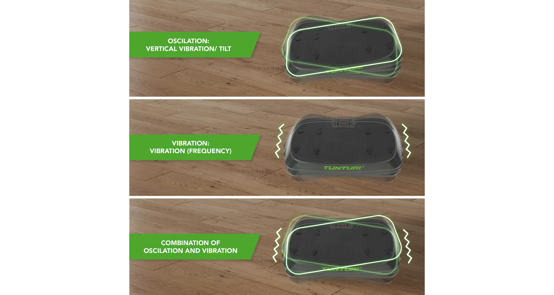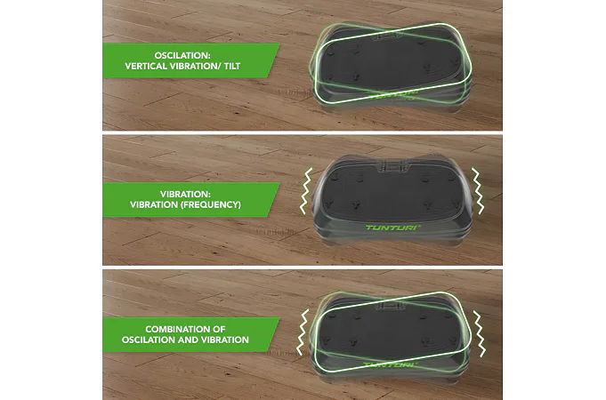 Vibrační deska má tři polohy, a to kmitání, vibrace a kombinaci obou. Vibrace znamená, že se deska pohybuje nahoru a dolů rychlým tempem. Oscilace je houpačka. Obě polohy zajišťují, že tělo je vyvedeno z rovnováhy a nutí svaly napnout, aby se udržela rovnováha. Díky tomu zapojíte mnoho svalových partií bez složitého cvičení. Kombinace vytváří trojrozměrný tréninkový efekt pro maximální výzvu. Vibrační deska je také vynikající pro méně intenzivní program, jako je relaxace po cvičení.