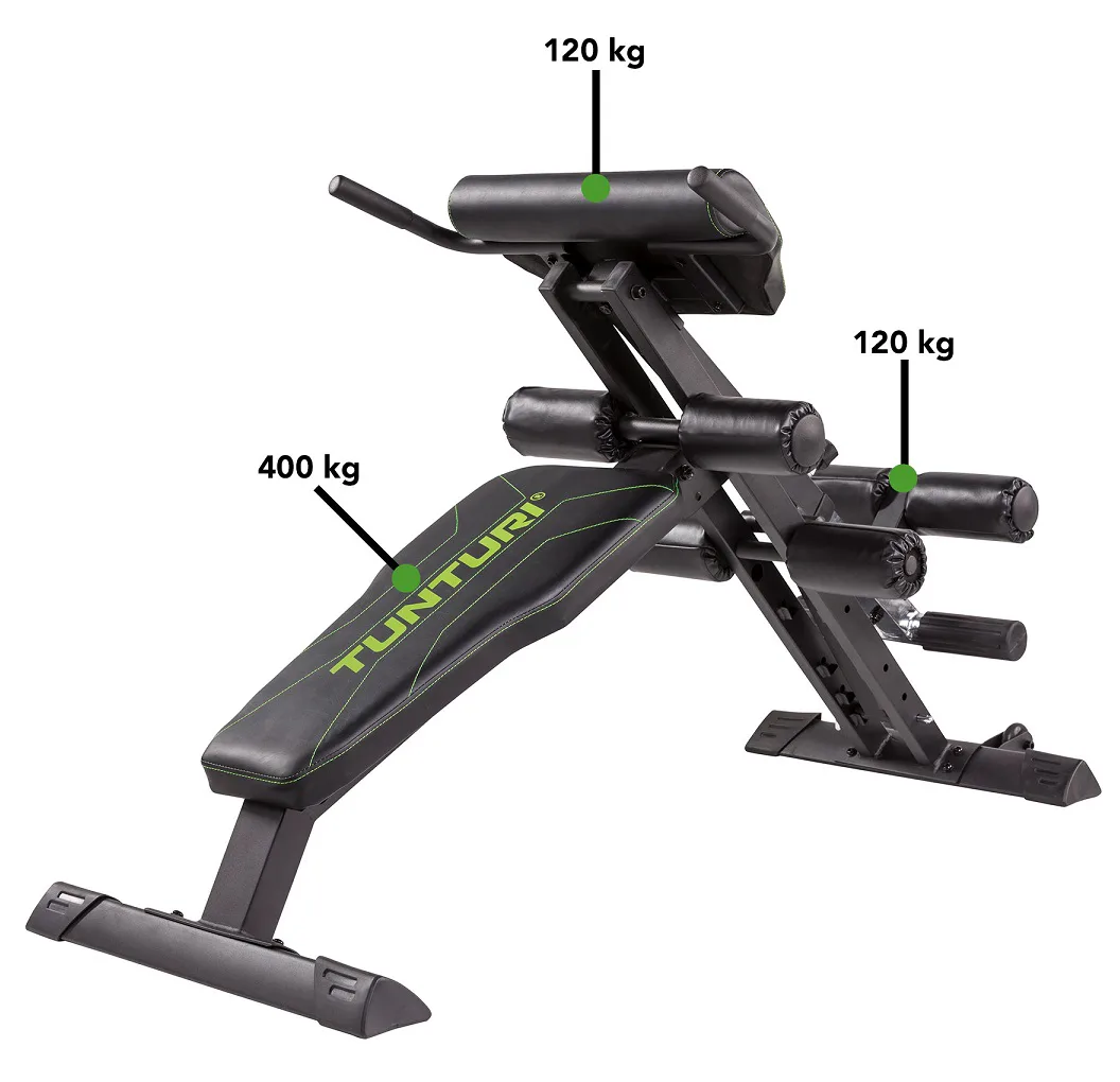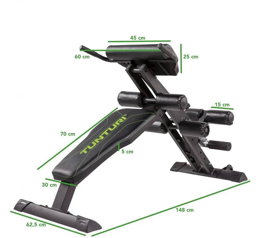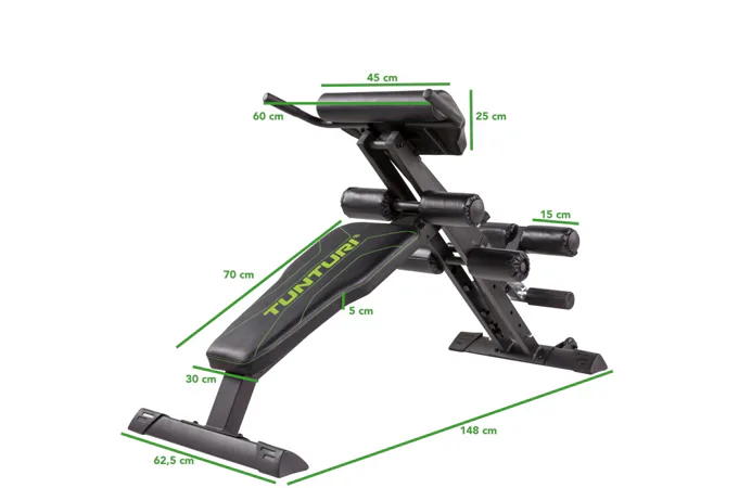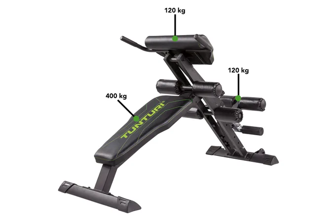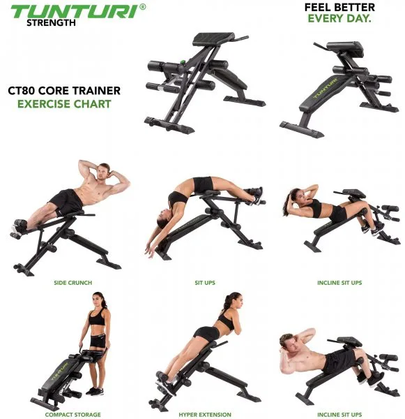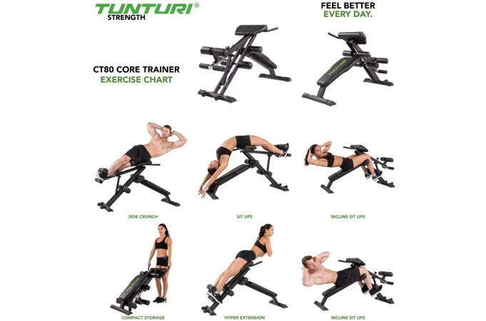 Tunturi CT80 Core trainer kombinuje dvě posilovací lavice, a to lavici na hyperextenzi na spodní zádové svaly a šikmou lavici na břišní svaly.