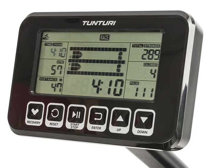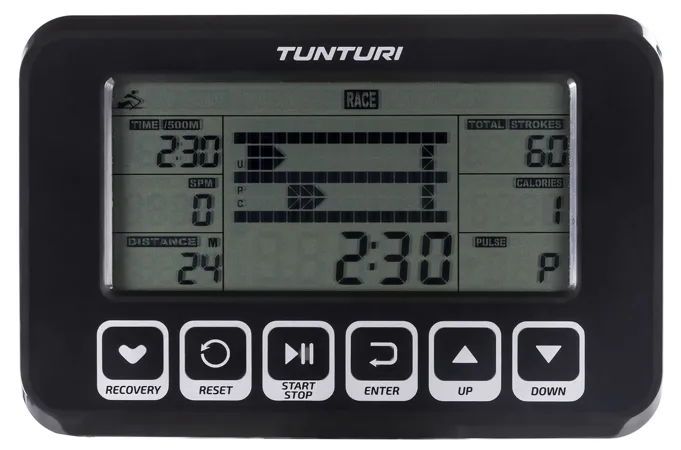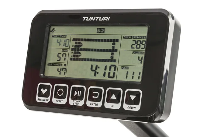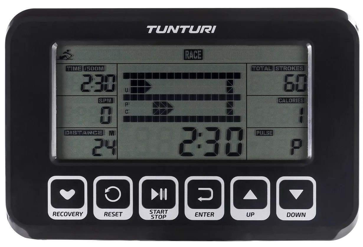 Součástí Tunturi FitRow 70 je počítač s přehledným LCD displejem, transportními kolečky a vyrovnávači nerovnosti.