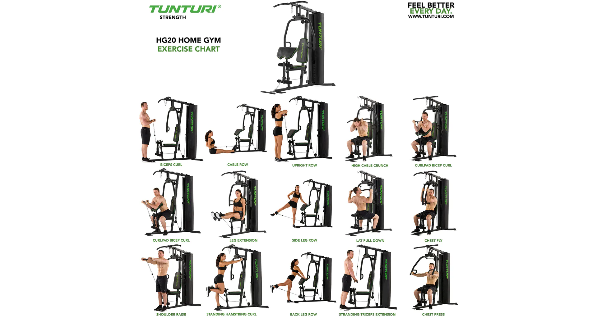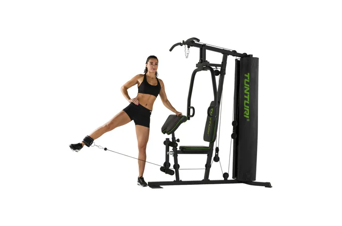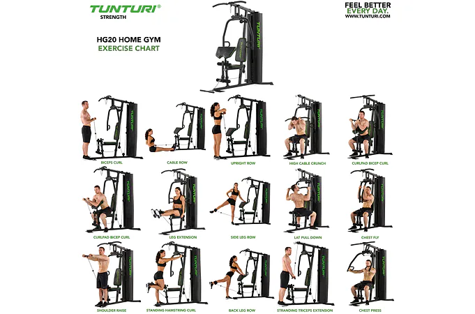 TUNTURI HG20 Home Gym patrí medzi univerzálne základné posilňovacie veže určené do domáceho prostredia. Veža vyniká tichým, komfortným chodom a veľkou univerzálnosťou pre drobnejšie osoby. Posilňovacia veža TUNTURI HG20 Home Gym predstavuje cenovo dostupné multifunkčné vybavenie, ktoré umožní veľmi účinne a bezpečne posilňovať všetky svalové skupiny ako hornej, tak dolnej časti tela. Posilňovacia veža je vhodná pre každého, kto má záujem o komplexný a bezpečný silový tréning. Jednotlivé stanovištia sú konštruované tak, aby malo plnohodnotnú ergonómiu pohybu pre konkrétneho cvičenca. Preto je pri cvičení aj s maximálnou záťažou vždy zaistené správne držanie tela a cvičiaci sa tak vyhne nežiaducim zraneniam.