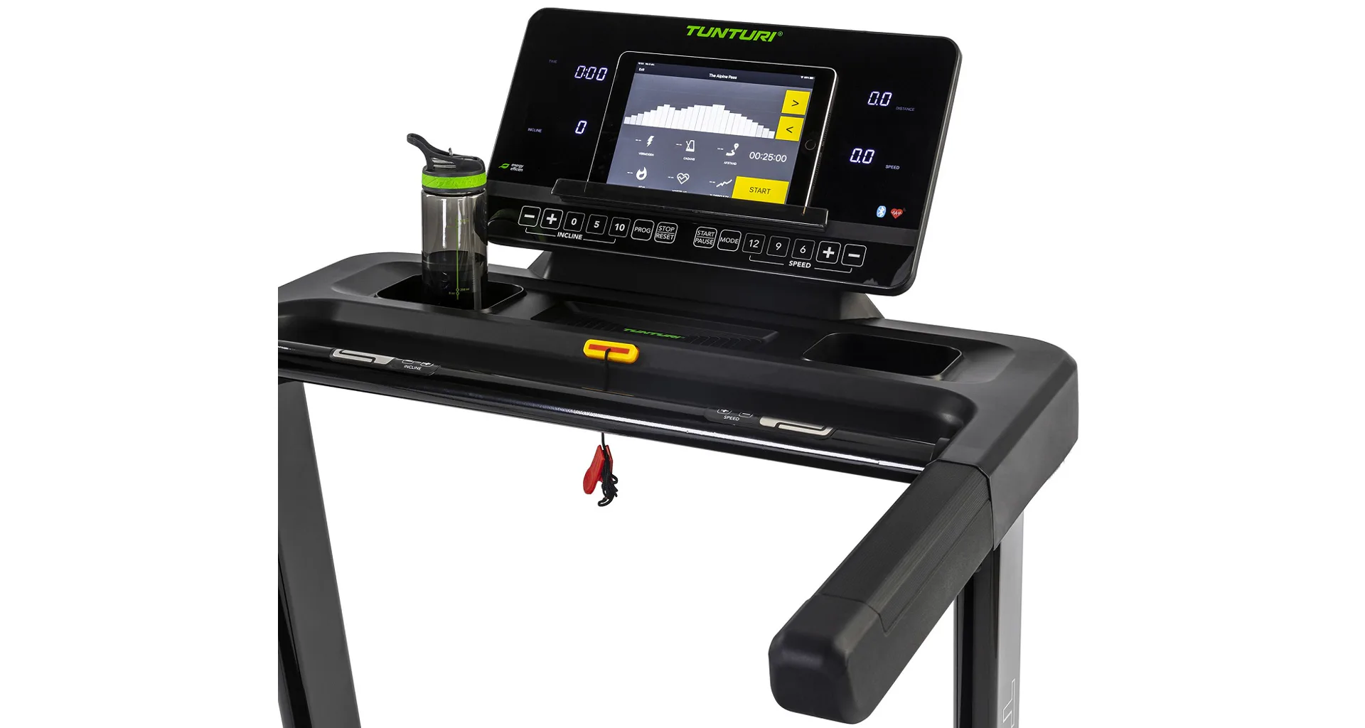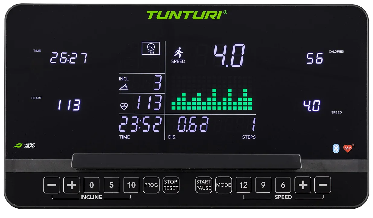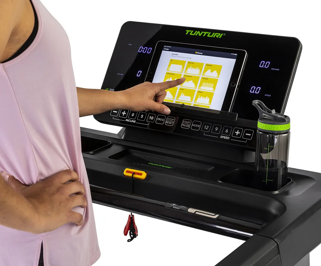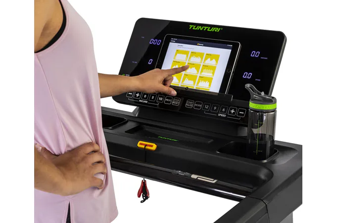 Průběh tréninku můžete sledovat na počítači s 10" LED displejem, který zobrazuje veškeré důležité hodnoty. Počítač disponuje praktickým držákem na tablet/smartphone, Bluetooth zařízením a USB portem pro nabíjení.