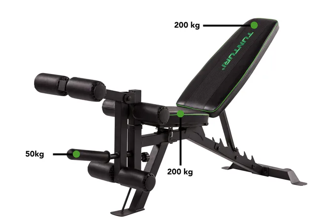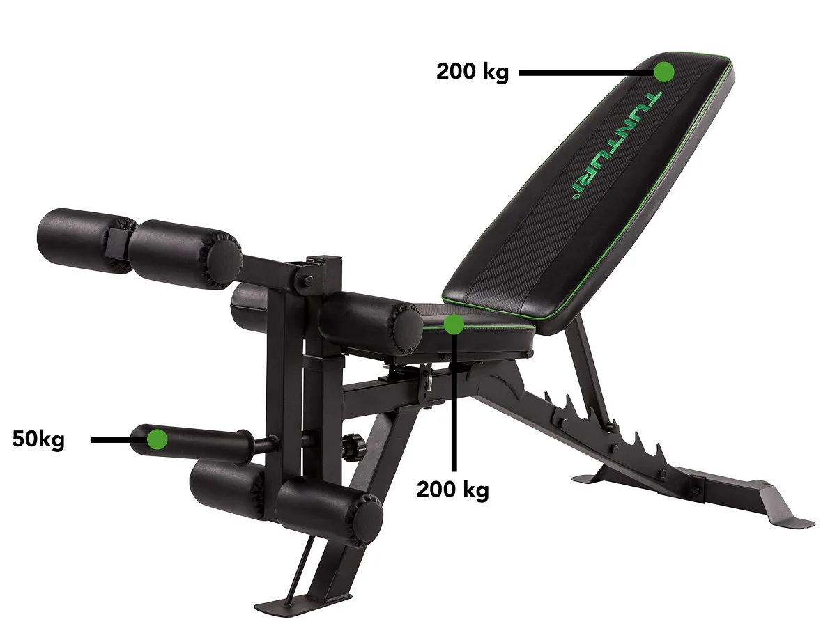 TUNTURI UB60 Utility Bench má celkovou nosnost 200 kg.