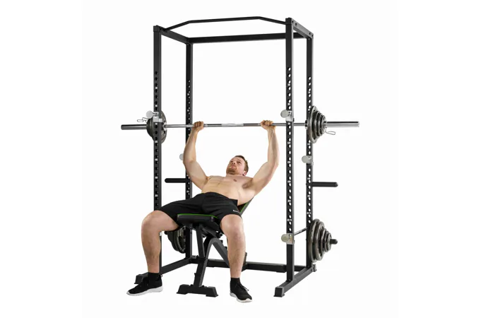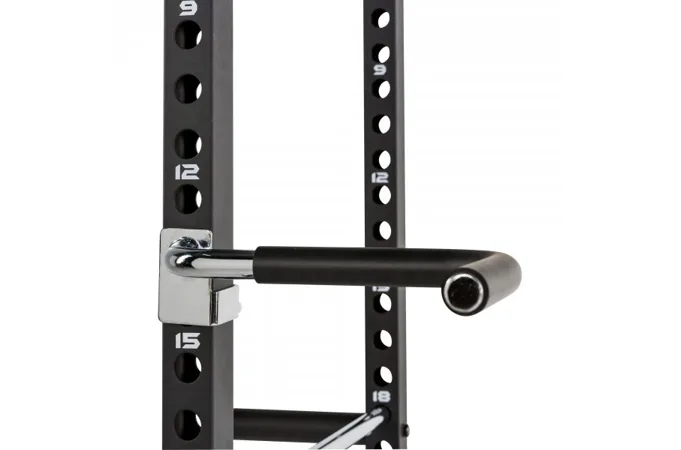 Součástí výbavy jsou odkládací a bezpečnostní zarážky, integrovaná hrazda a adaptéry na tricepsové kliky.