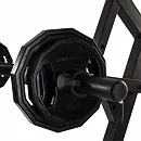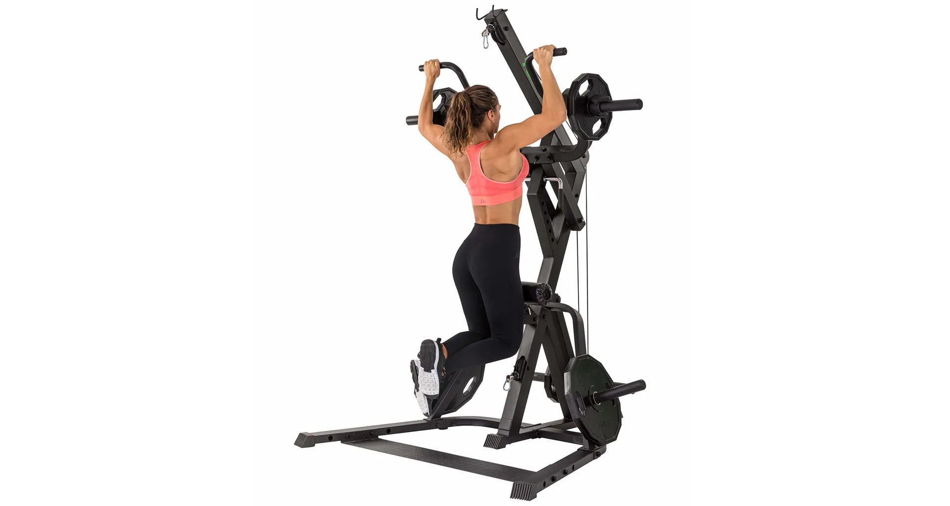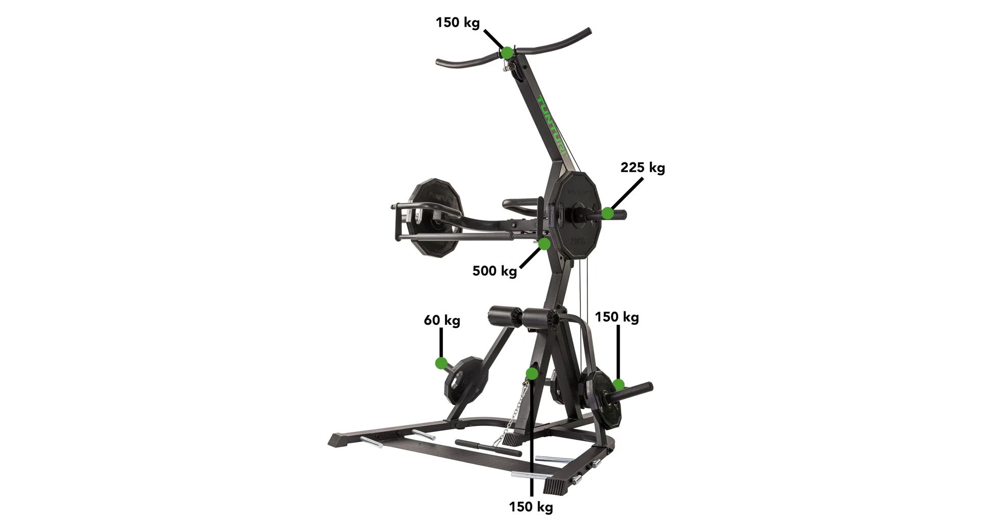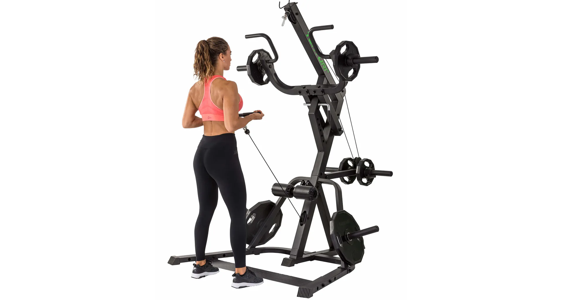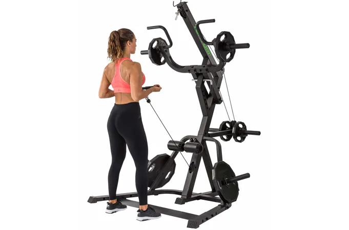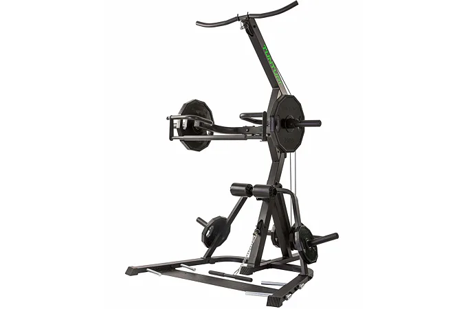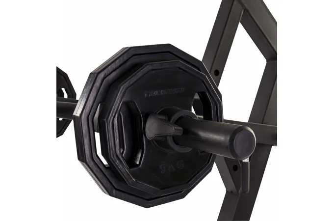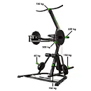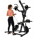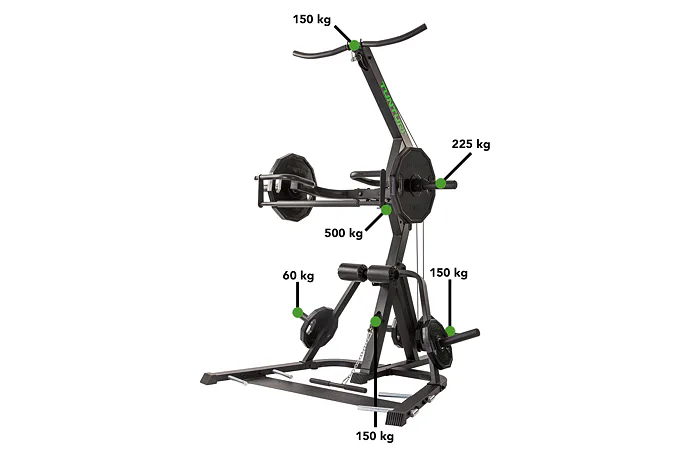 Nastavení zátěže je libovolné pomocí kotoučů s vrtáním 30 mm nebo 50 mm. Součástí je kladkový systém, páková ramena, pěnové válce na fixaci nohou a odkládací trny na kotouče. Posilovací stoj je možné kombinovat s posilovací lavicí.