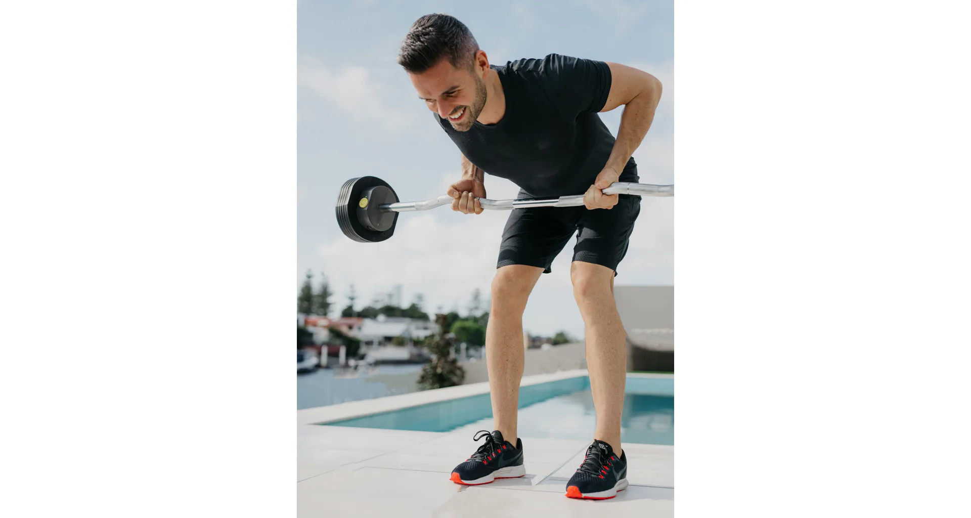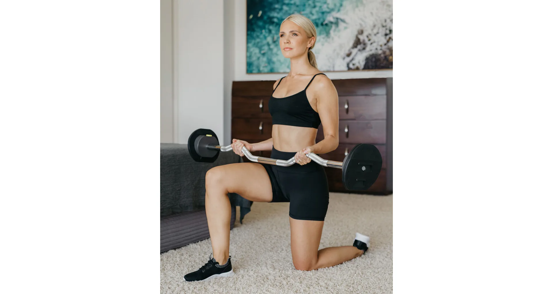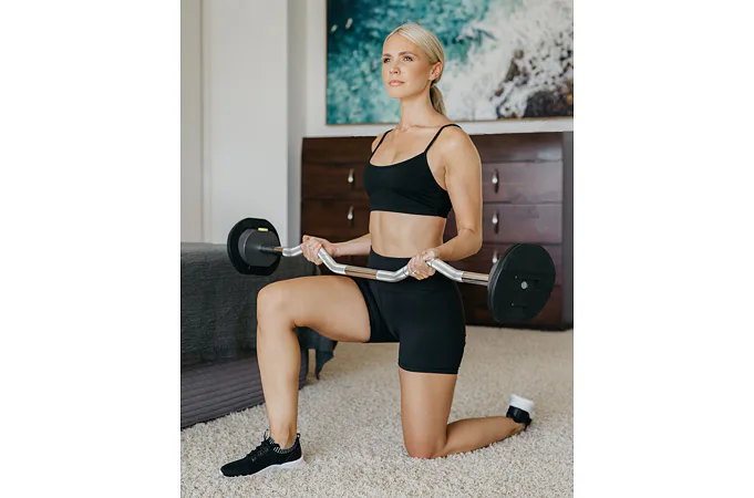 Sada obsahuje rovnú tyč, tyč EZ-curl, 45,3 kg závaží a kompaktný úložný stojan.