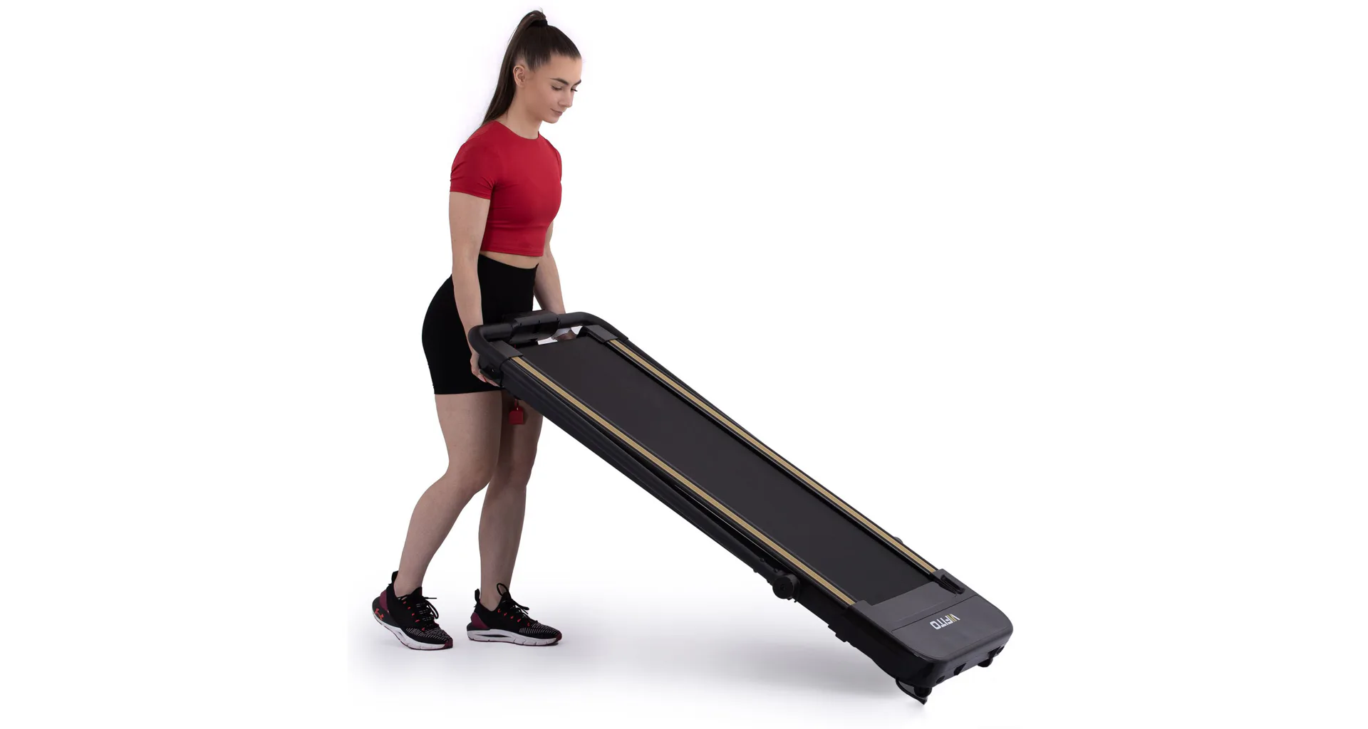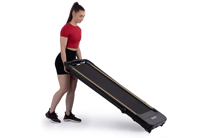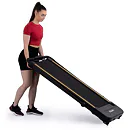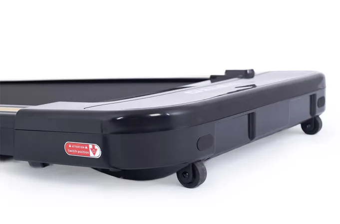 Pokud běžecký pás zrovna nepoužíváte, můžete jej jednoduše kompletně složit a uložit například pod postel. Sklopení a manipulaci s pásem usnadňují i transportní kolečka.