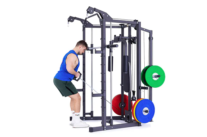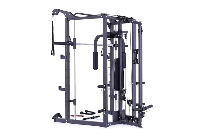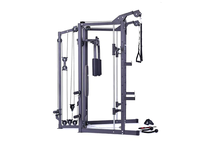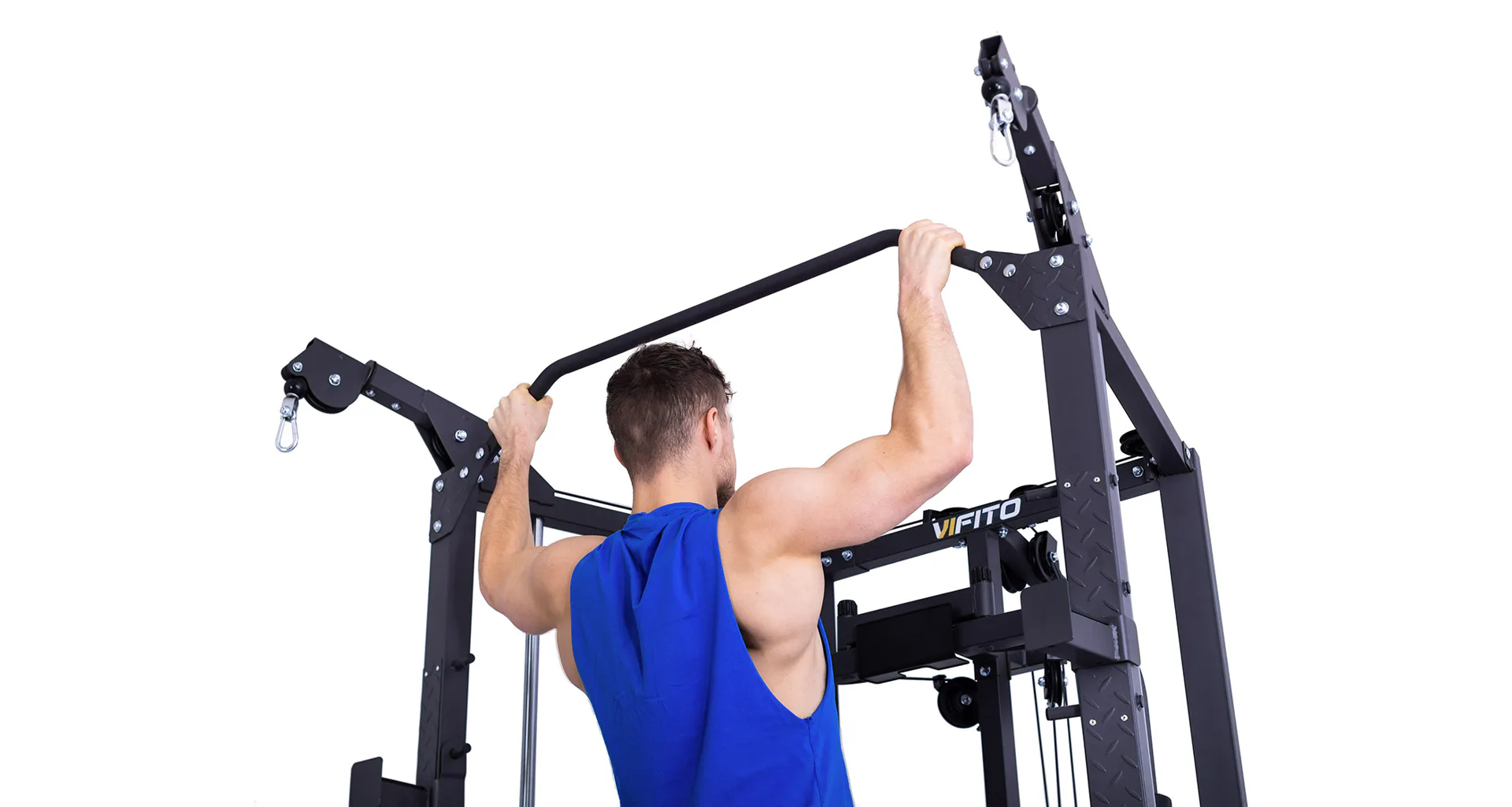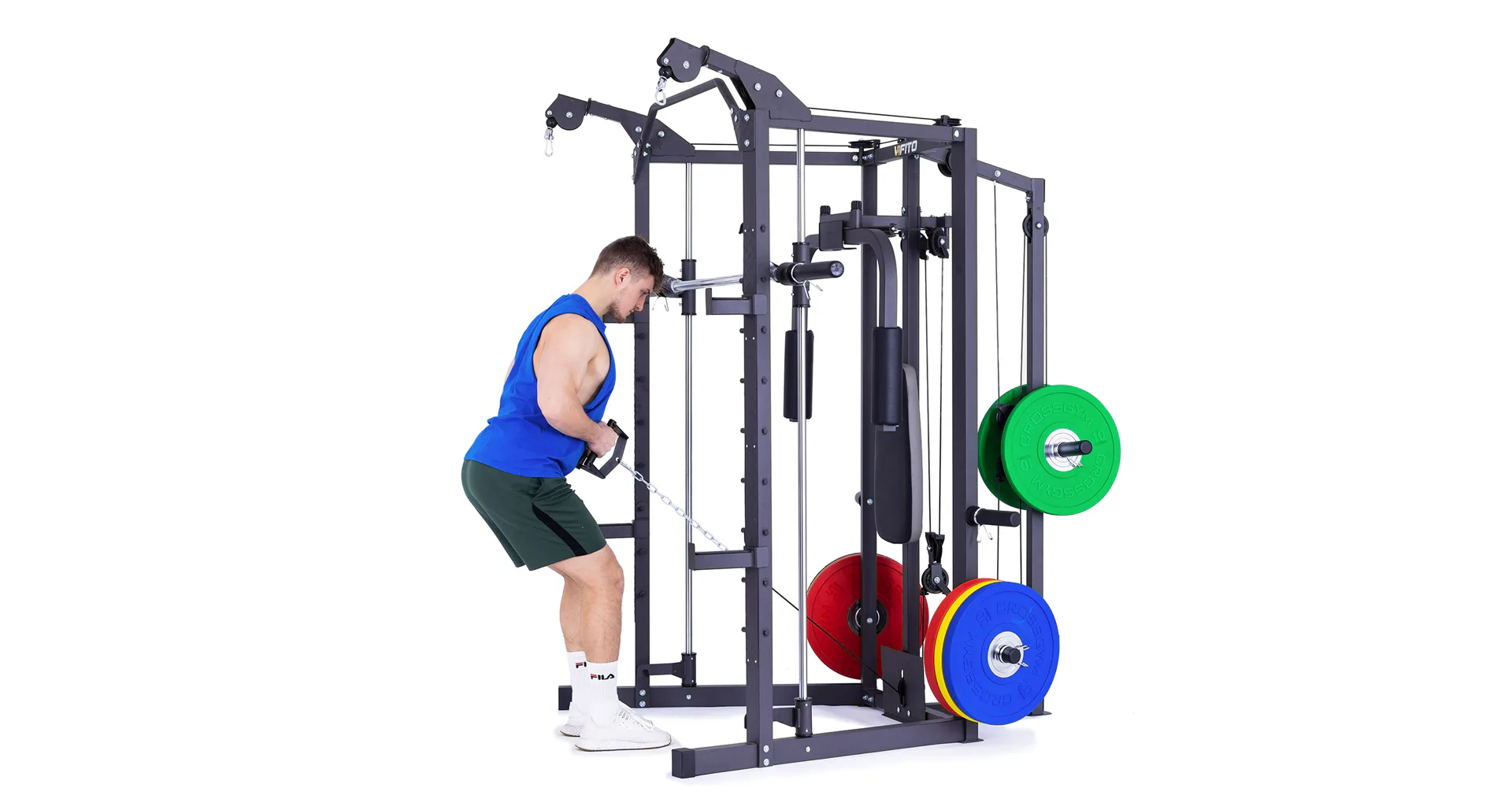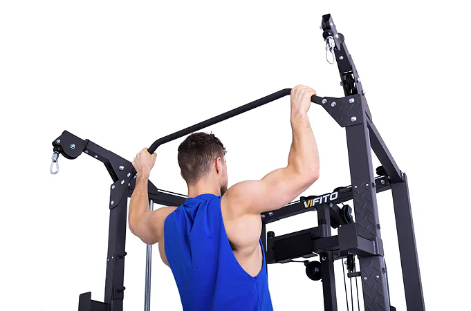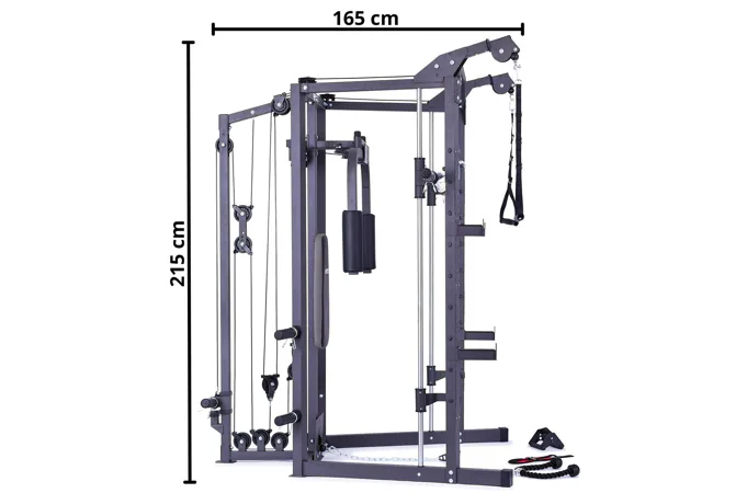 Součástí posilovací klece VIFITO Omega S40 jsou dvě protisměrné kladky, peck-deck pro posilování prsních svalů, spodní kladka s opěrkou na nohy, například pro veslování a hrazda, díky které docílíte skvělému zapojení zádových svalů. V přední části konstrukce je možné použít výškově nastavitelné stojany na velkou činku a bezpečnostní dorazy. Všechny kladky a multipress jsou osazeny kvalitními lineárními ložisky s mechanismem pro dopínání, které zaručují přirozenou ergonomii.