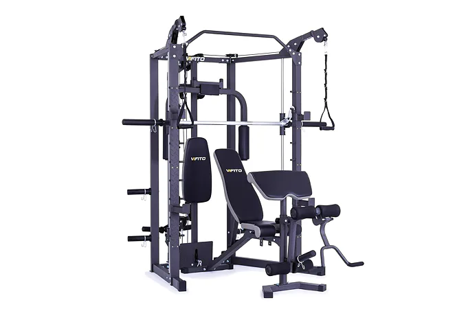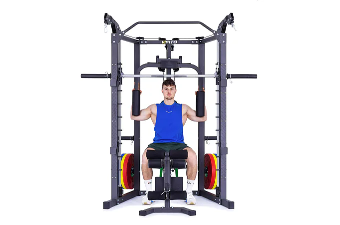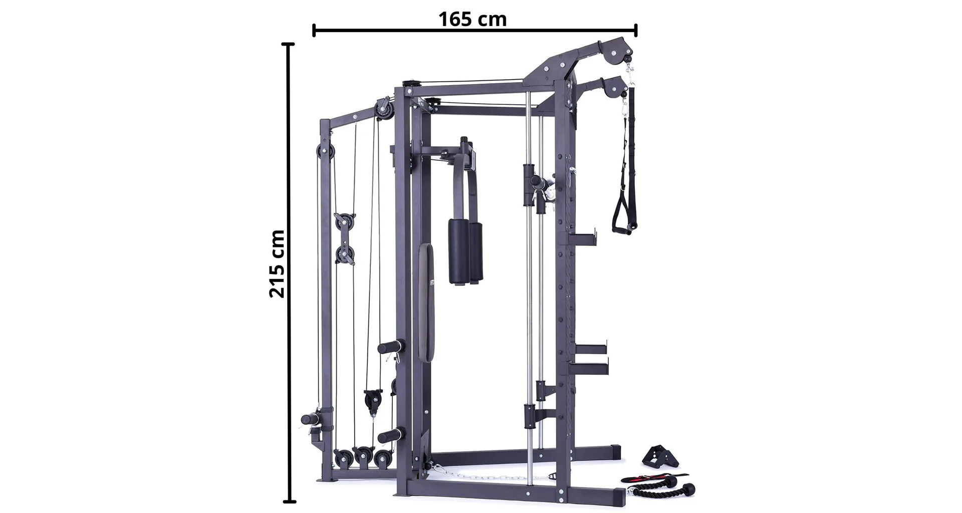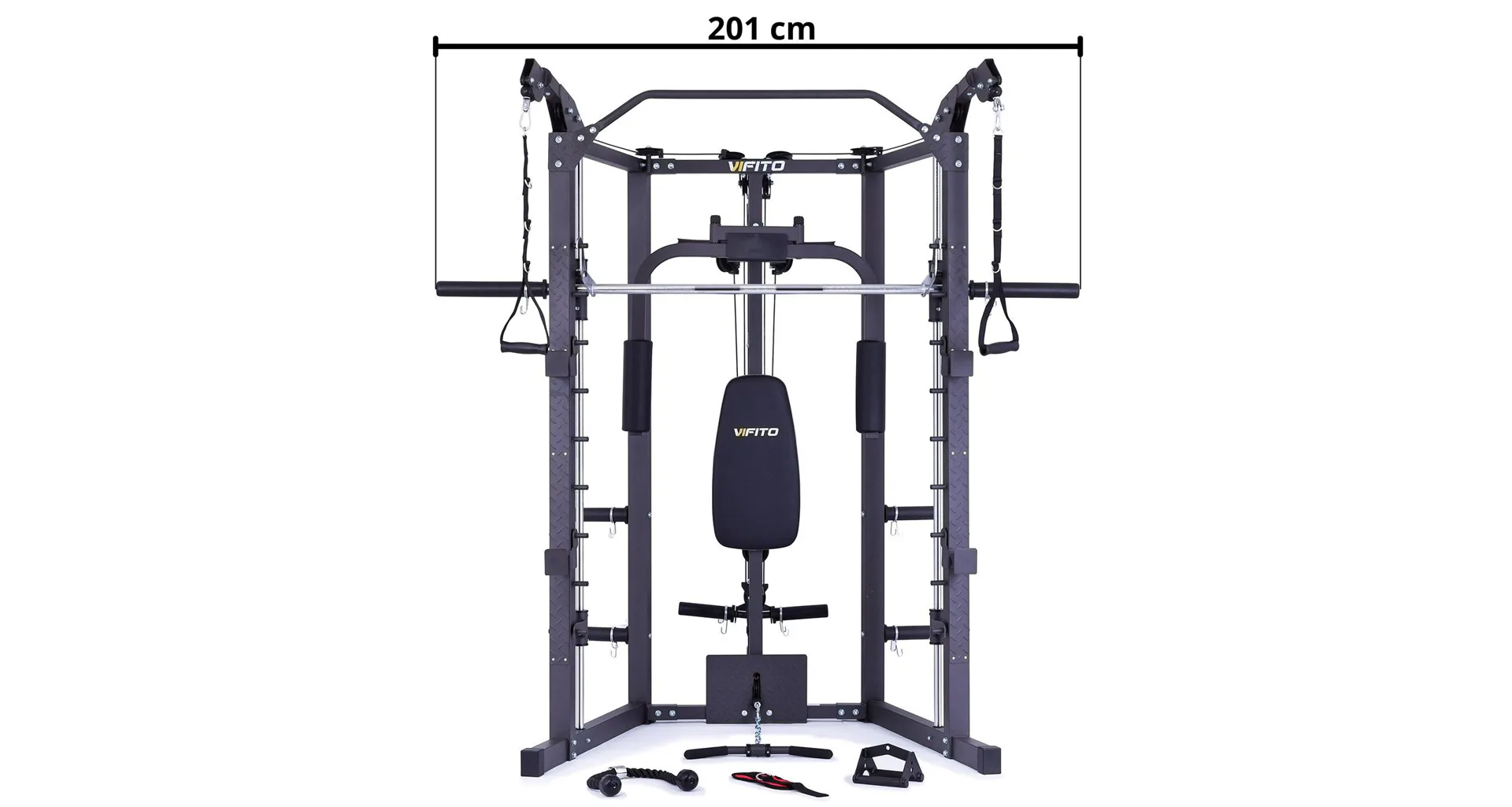 Univerzální multipress VIFITO Omega S40 pro náročné. Díky svým rozměrům (d x š x v): 165 x 201 x 215 cm vám bude stroj zabírat okolo 4 m2. Proto je tento kombinovaný multipress ideálním řešením do domácí posilovny. Rozměry samotné základny stroje jsou (d x š): 150 x 90 -140 cm.