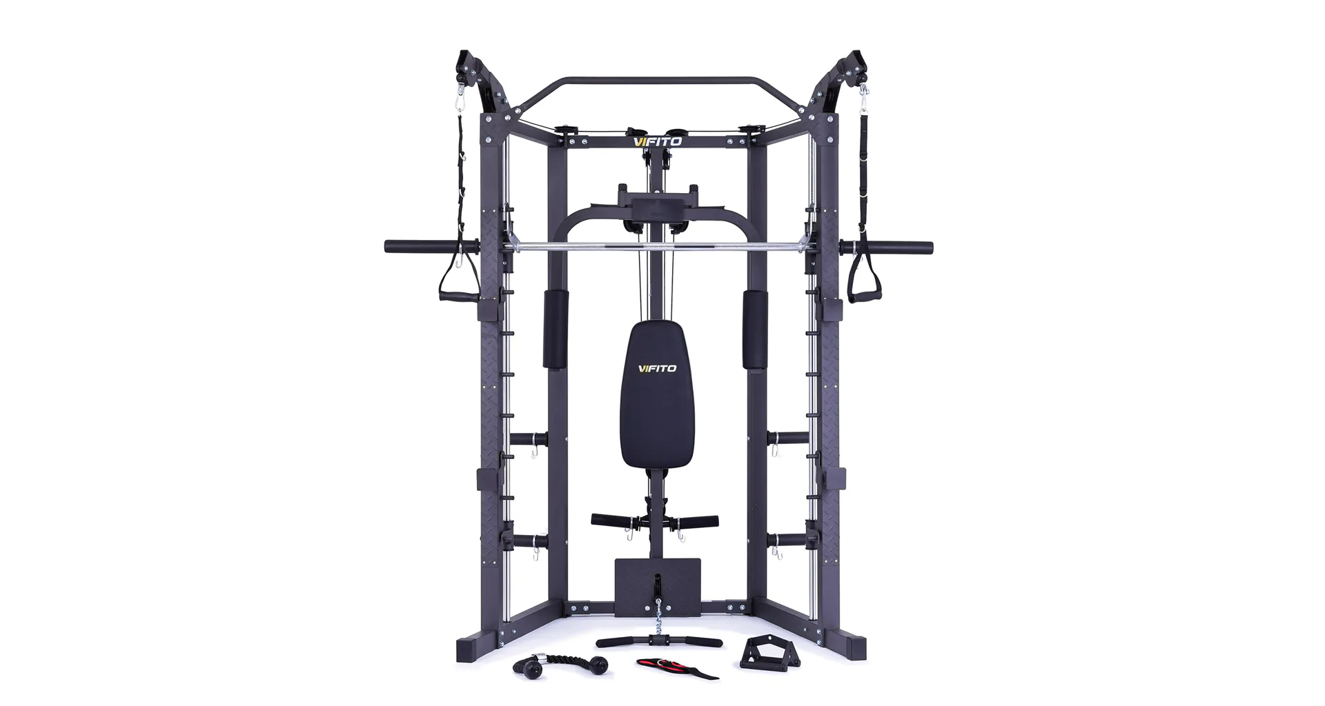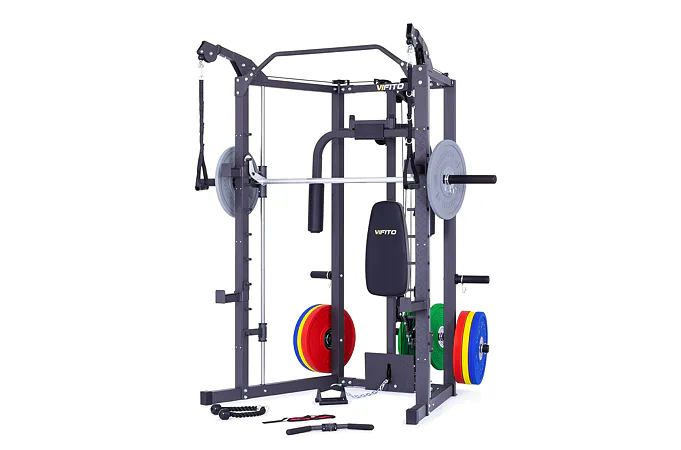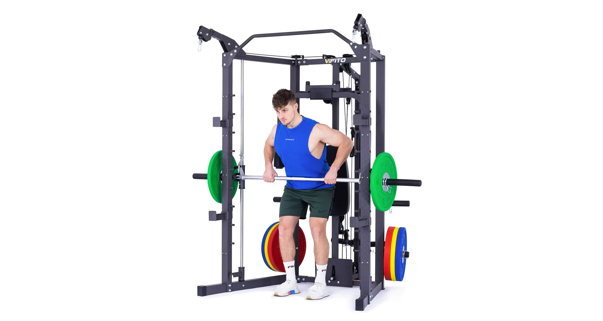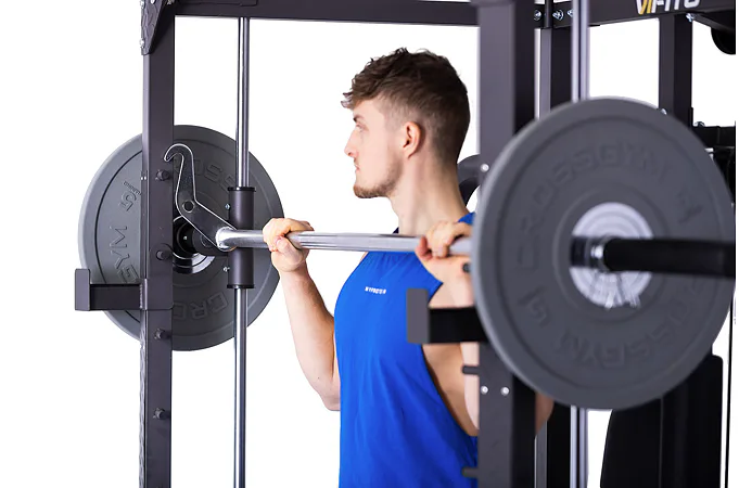 VIFITO Omega S40 má masivní ocelovou konstrukci, kde můžete zvolit výšku vedené osy multipressu pro daný cvik v 9 polohách podle potřeb každého z vás. Průměr nakládacích trnů chromované osy lze zvětšit z 25 mm na 50 mm (olympijské), díky standardně dodávanému adaptéru. Což vás neomezí v libovolném výběru kotoučů s vrtáním 25, 30 nebo 50 mm. Váhu si zvolí každý podle svých sil a potřeb.