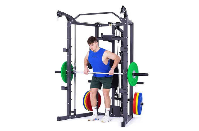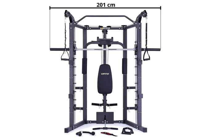 VIFITO Omega S40B má masivní ocelovou konstrukci, kde můžete zvolit výšku vedené osy multipressu pro daný cvik v 9 polohách podle potřeb každého z vás. Průměr nakládacích trnů chromované osy lze zvětšit z 25 mm na 50 mm (olympijské), díky standardně dodávanému adaptéru. Což vás neomezí v libovolném výběru kotoučů s vrtáním 25, 30 nebo 50 mm. Váhu si zvolí každý podle svých sil a potřeb.