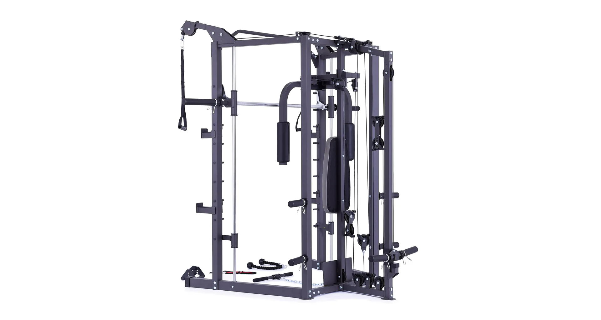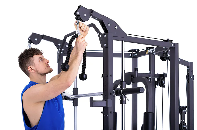 Součástí posilovací klece VIFITO Omega S40B jsou dvě protisměrné kladky, peck-deck pro posilování prsních svalů, spodní kladka s opěrkou na nohy, například pro veslování a hrazda, díky které docílíte skvělému zapojení zádových svalů. V přední části konstrukce je možné použít výškově nastavitelné stojany na velkou činku a bezpečnostní dorazy. Všechny kladky a multipress jsou osazeny kvalitními lineárními ložisky s mechanismem pro dopínání, které zaručují přirozenou ergonomii.