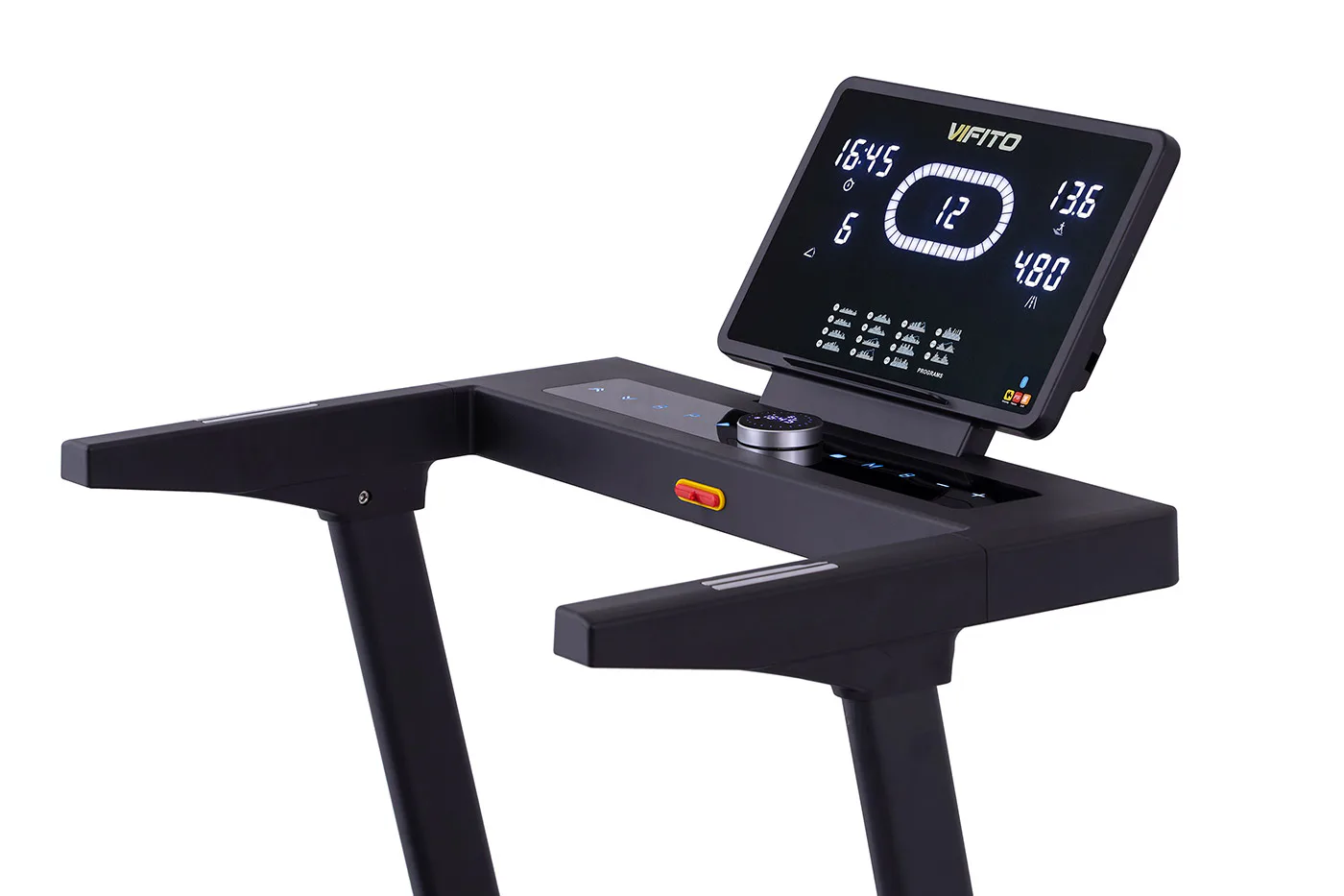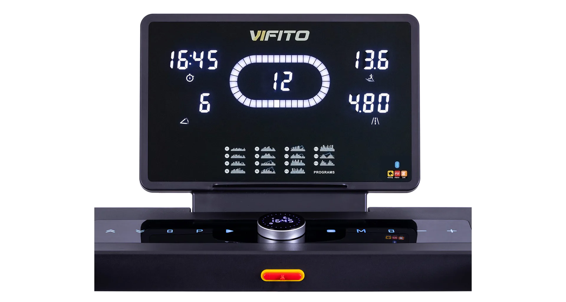 VIFITO Rio 350 iR nabízí přehledný a podsvětlený Multi-LED displej s bohatou programovou nabídkou pro efektivní a zábavný trénink. Umožní vám sledovat váš trénink v reálném čase pomocí dat monitorujících vaši rychlost, čas, vzdálenost, spálené kalorie a srdeční frekvenci. K ovládání také slouží univerzální kolečko pod displejem.