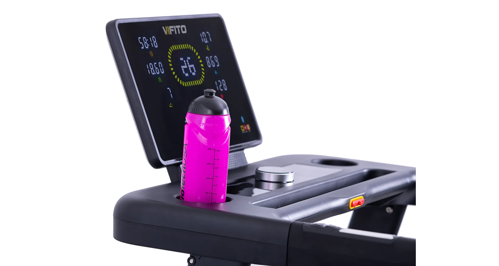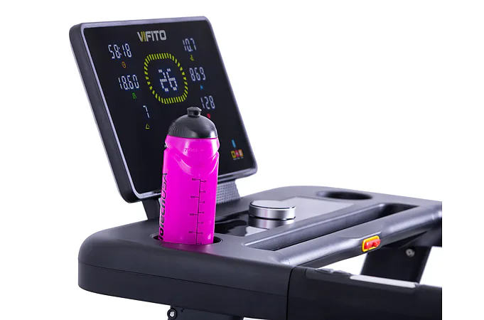 Běžecký pás VIFITO Rio 450 je vybaven praktickým držákem na pití umístěným hned u počítače, což přináší několik výhod.