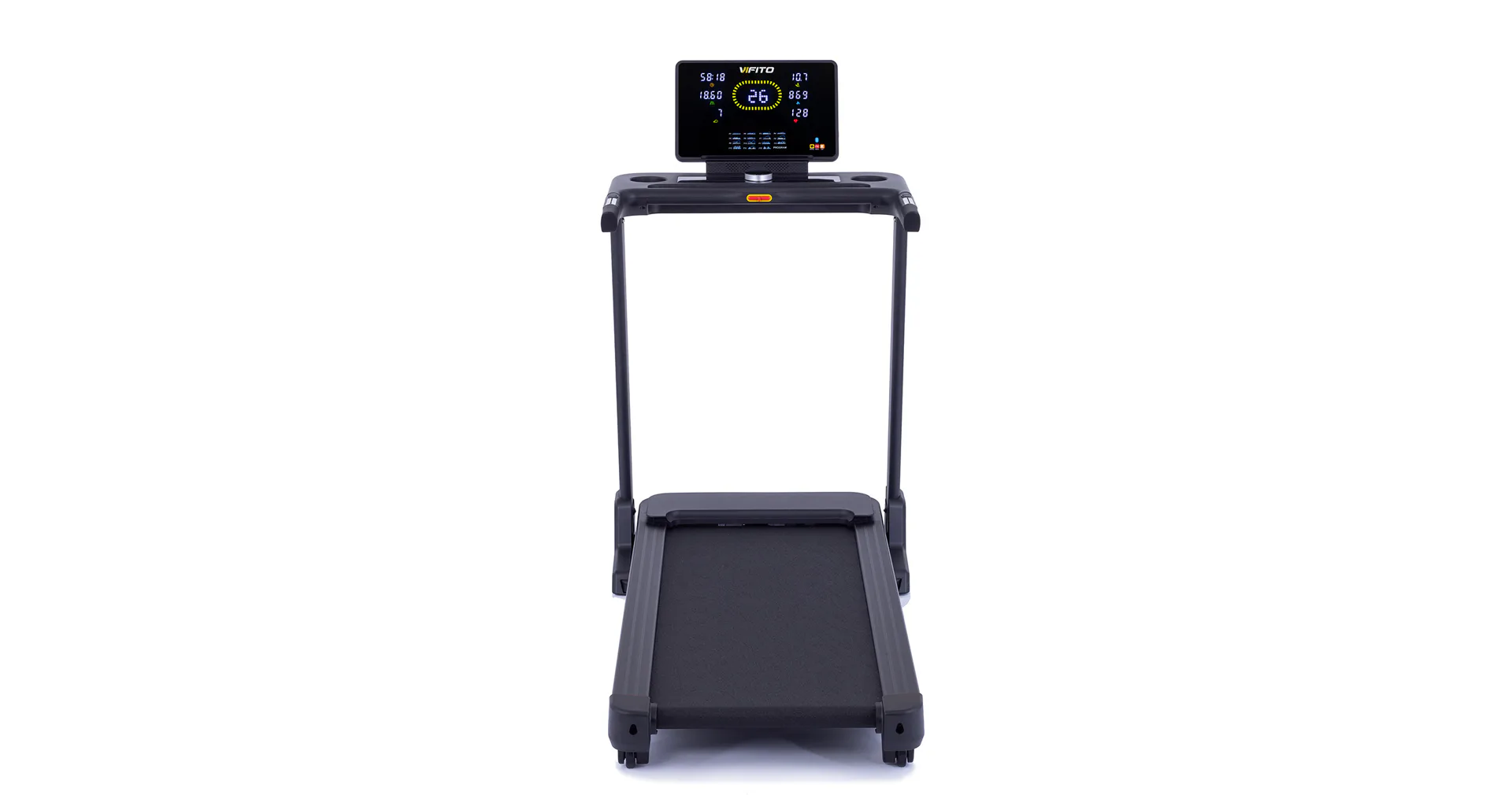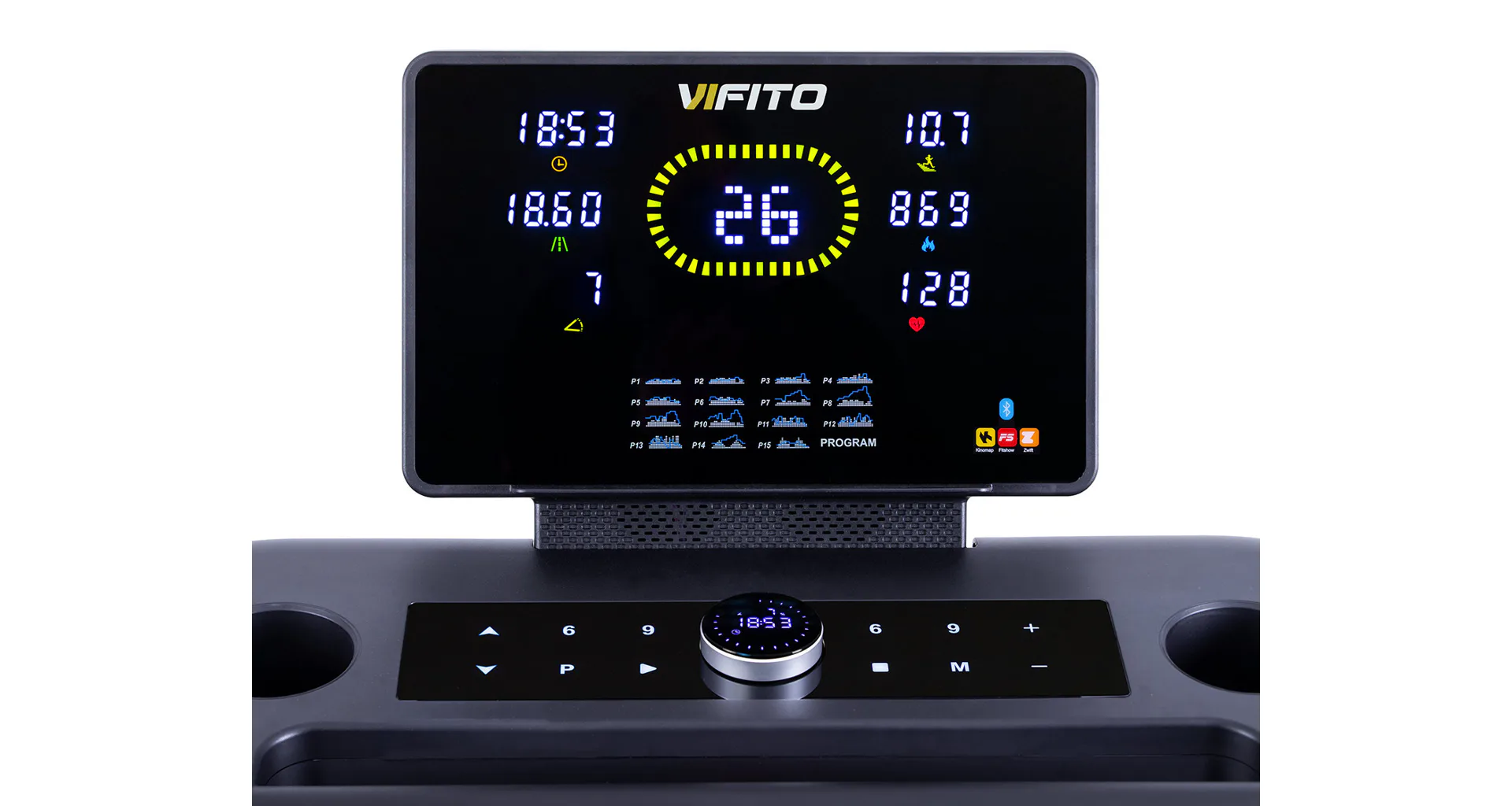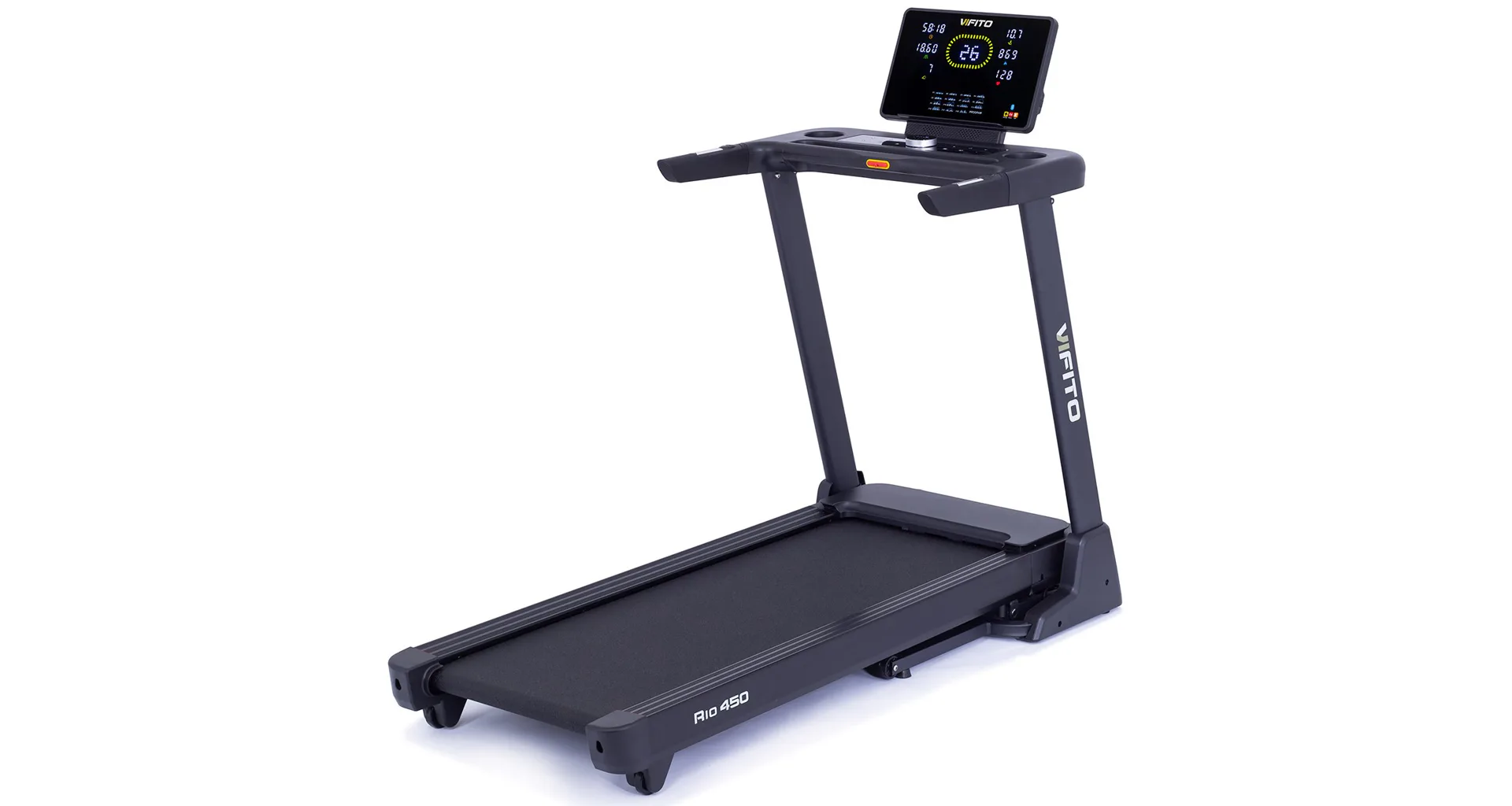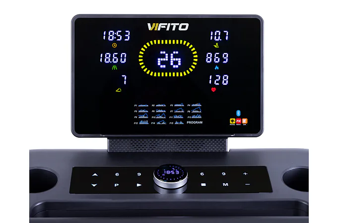 VIFITO Rio 450 nabízí přehledný a podsvětlený LED displej s bohatou programovou nabídkou pro efektivní a zábavný trénink. Umožní vám sledovat váš trénink v reálném čase pomocí dat monitorujících vaši rychlost, čas, vzdálenost, spálené kalorie a srdeční frekvenci. K ovládání také slouží univerzální kolečko pod displejem.