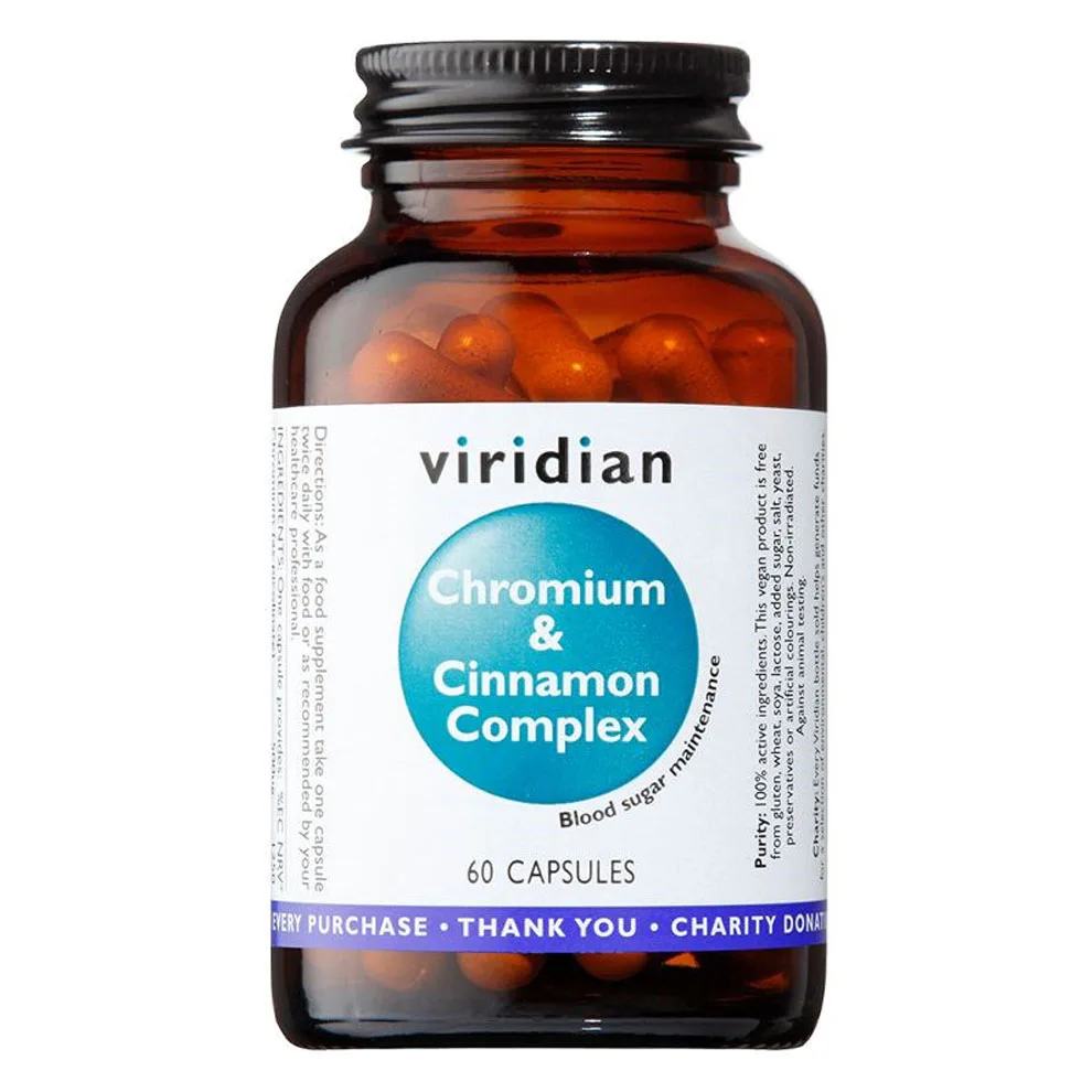 VIRIDIAN Chromium & Cinnamon Complex je komplexný doplnok stravy určený na podporu pri problémoch s prejedaním, pri nadmernej chuti na sladké (či akékoľvek iné jedlá), pri nestabilnej či zvýšenej hladine krvného cukru a tiež v oblasti kontroly hmotnosti. Vďaka obsahu škorice je Chromium & Cinnamon Complex určený primárne pre oblasť problémov s prejedaním či neustálej chuti do jedla, zatiaľ čo G.T.F. Chromium Complex je zameraný na komplexnú podporu pri problémoch s krvným cukrom, inzulínovou rezistenciou, cholesterolom a pod.