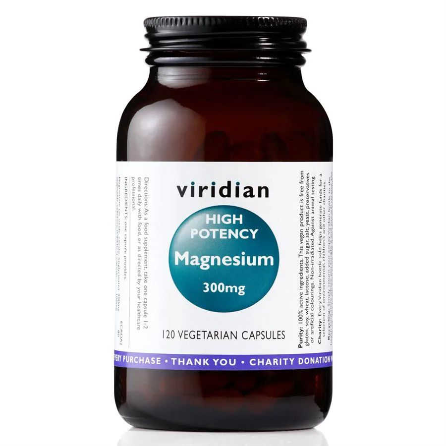 VIRIDIAN High Potency Magnesium obsahuje v jednej kapsule vysokú dávku horčíka (300 mg = 80% odporúčanej dennej dávky) zloženú z troch foriem – bisglycinátu horečnatého, citrátu horečnatého a oxidu horečnatého. Tieto tri formy dohromady dávajú veľmi efektívnu synergnú zmes dobre využiteľnú pre telo.