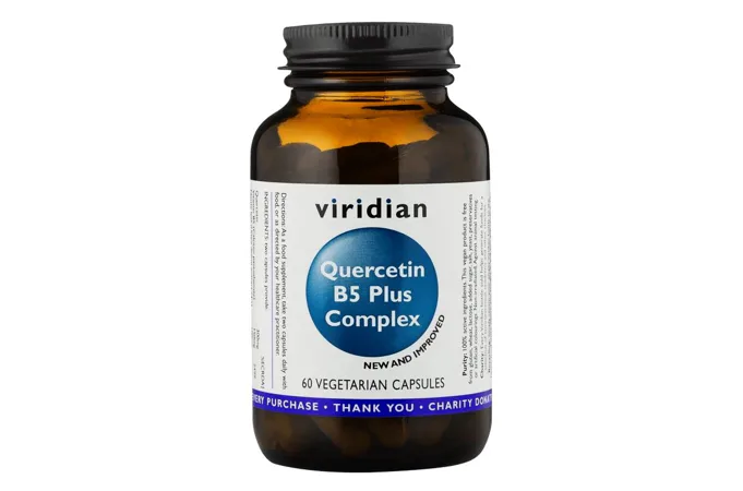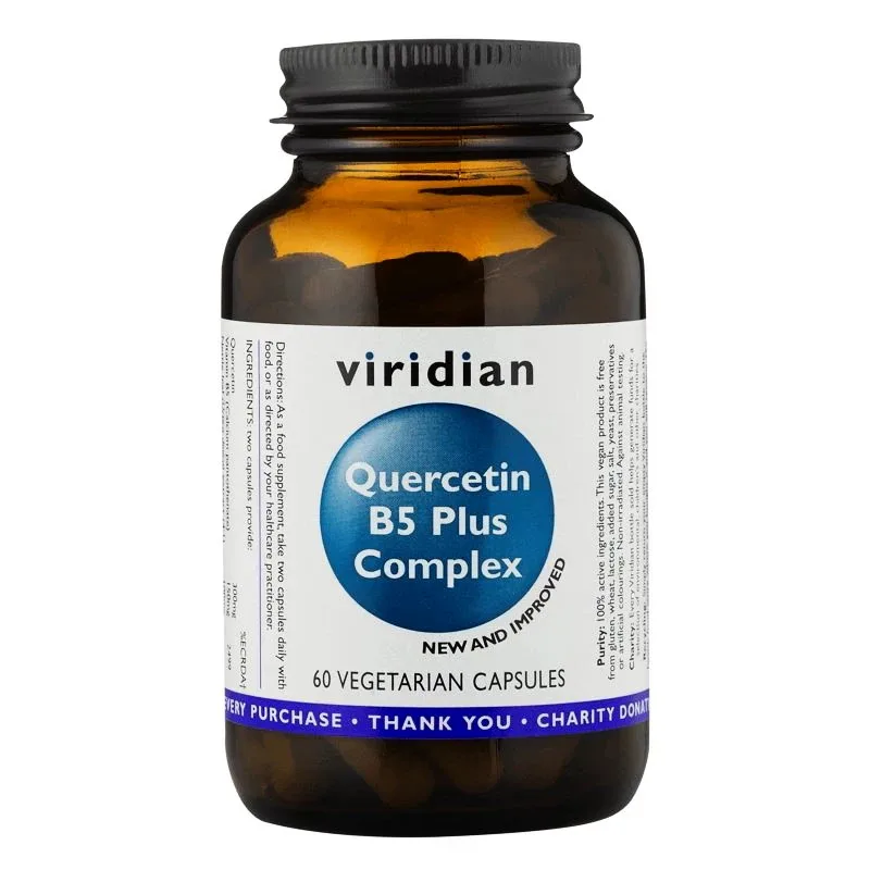 VIRIDIAN Quercetin B5 Plus. Quercetin je veľmi účinný flavonoid, ktorý sa prirodzene vyskytuje napríklad v citrusových plodoch. Komplex Viridian ďalej obsahuje vitamín B5, extrakt žihľavy, kvet harmančeka, borovú kôru, bromelain (z ananásu) a acerolu, ktorá je výborným zdrojom vitamínu C.