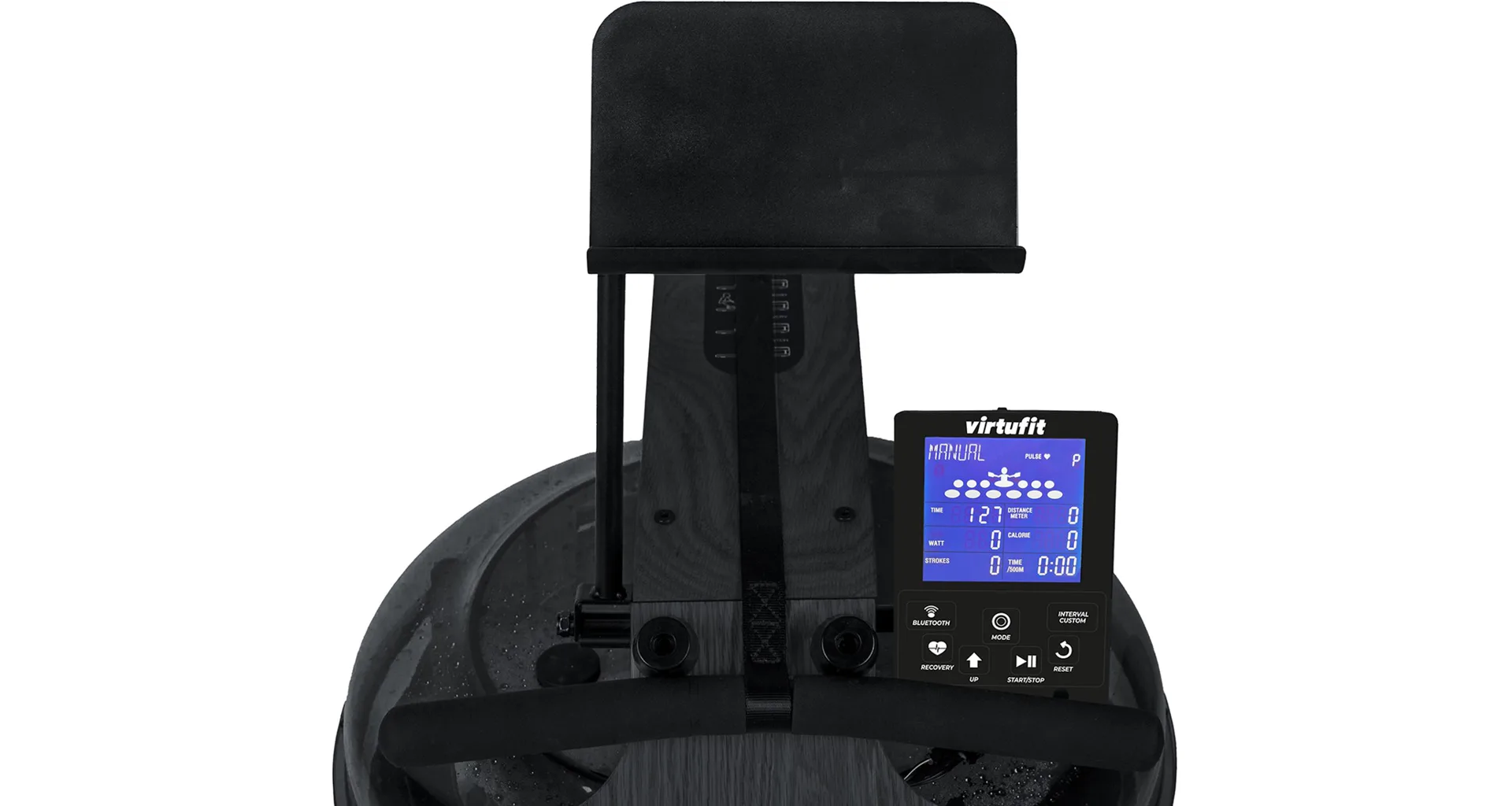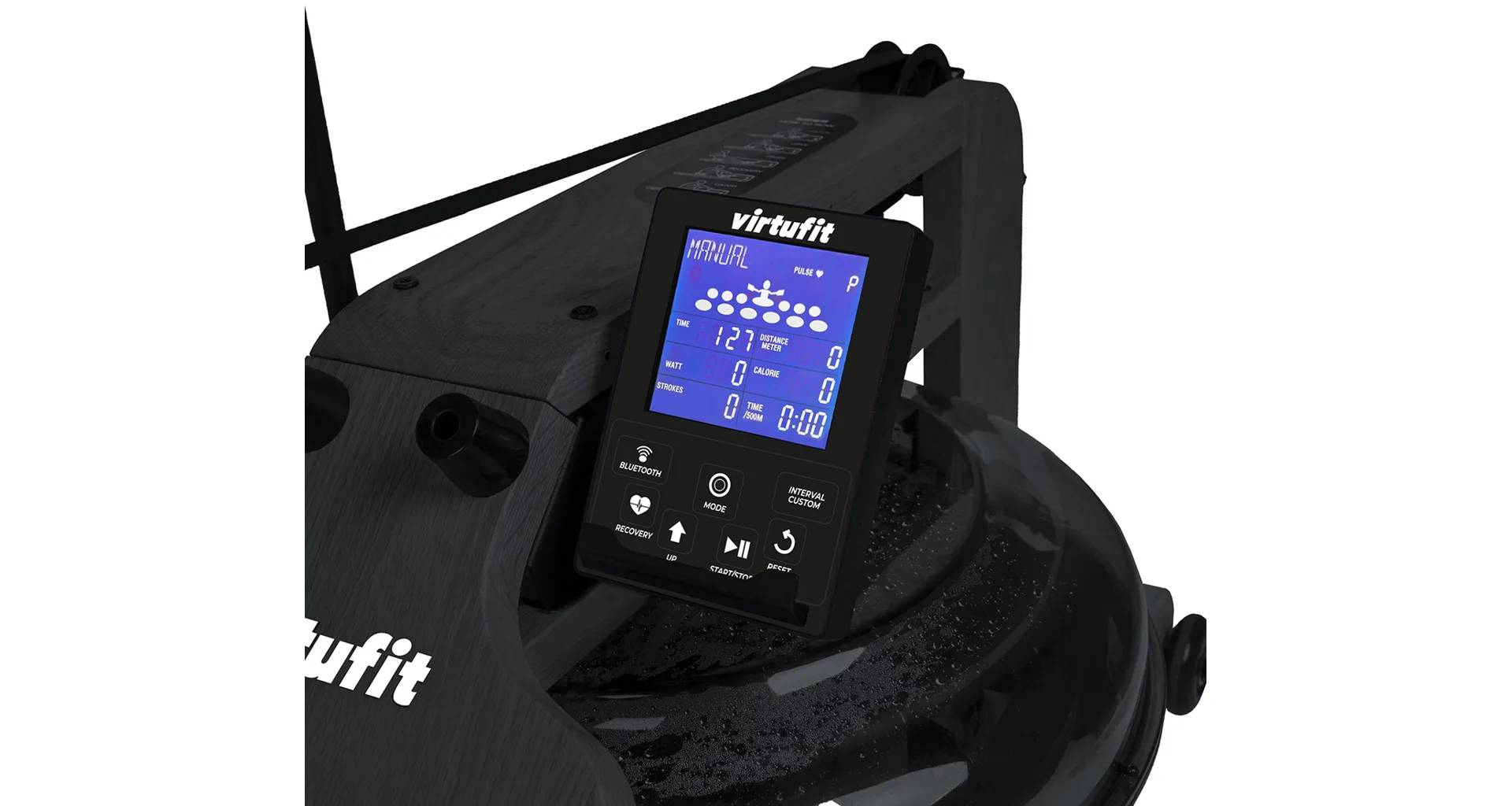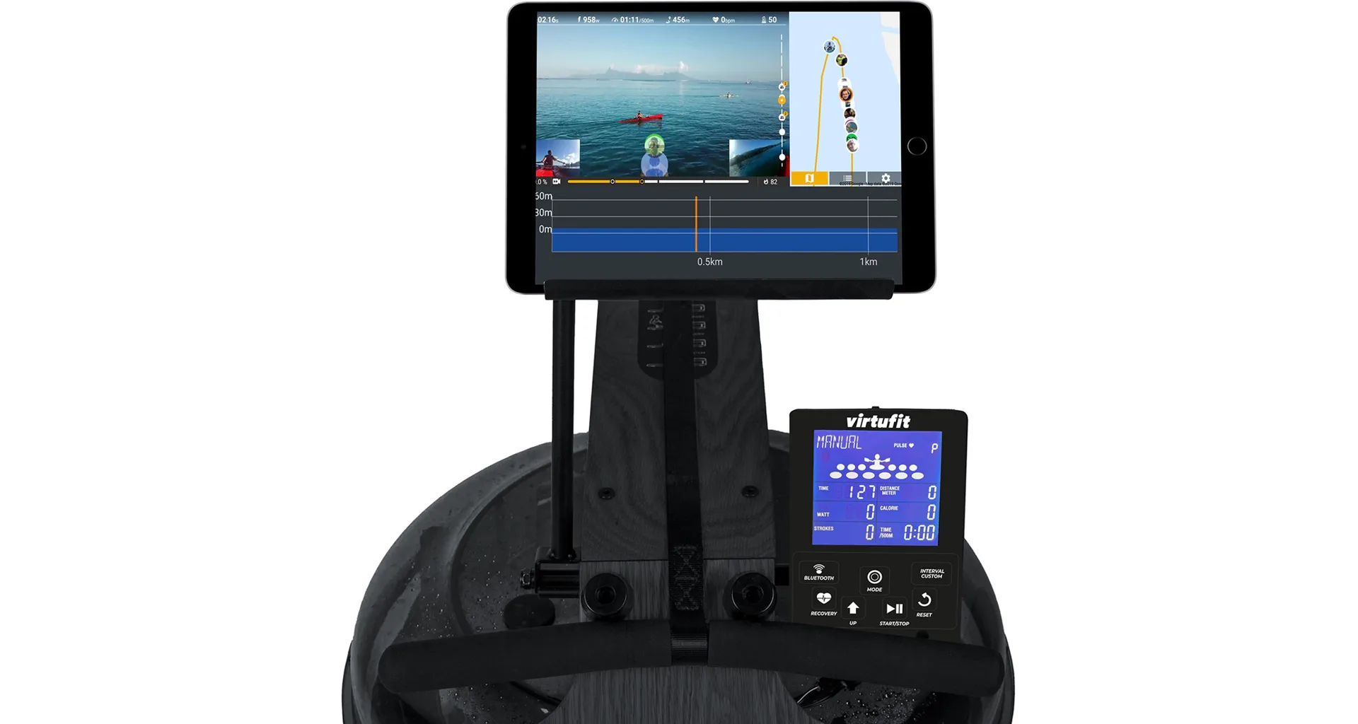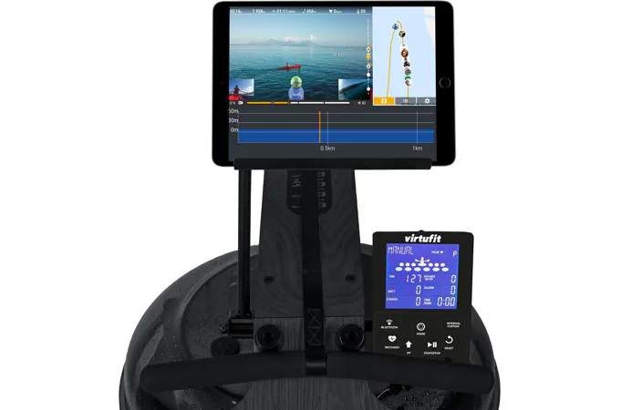 Veslo VirtuFit Elite Water Resistance Wood také disponuje přehledným počítačem s držákem na tablet/smartphone, transportními kolečky, vyrovnávači nerovnosti a možností sklopení do vertikální polohy.