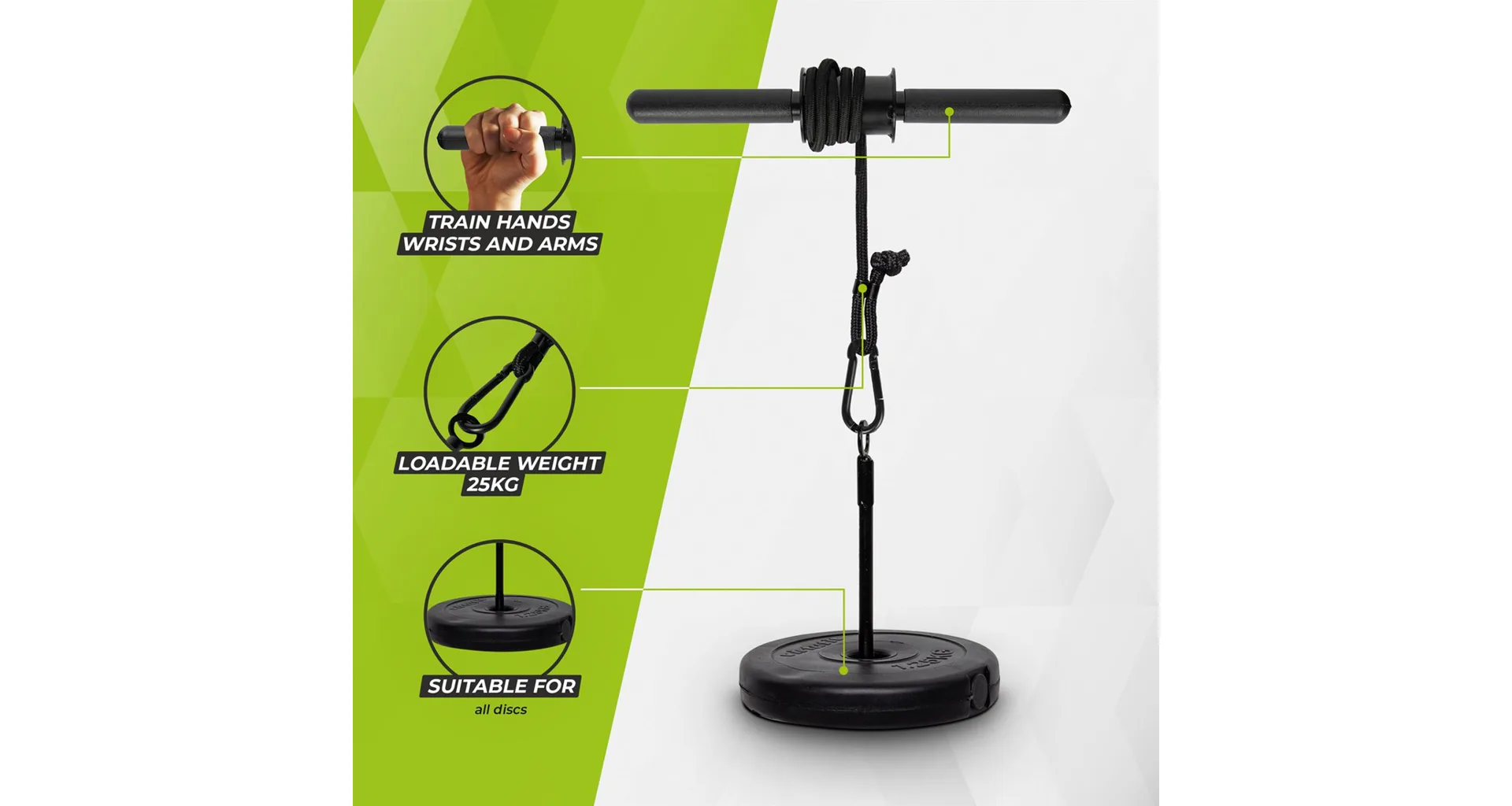 Posilňovač paží VirtuFit Wrist Roller je nástroj na trénovanie predlaktia. Je to ideálny spoločník pre nenáročné posilňovacie tréningy zápästia. Stačí zavesiť požadované závažia na karabínu, ktorá je umiestnená na šnúre pre vysoké zaťaženie. Ak chcete trénovať, naviňte kábel hore a dole predlaktím a zápästím.