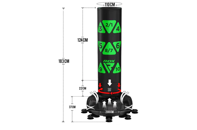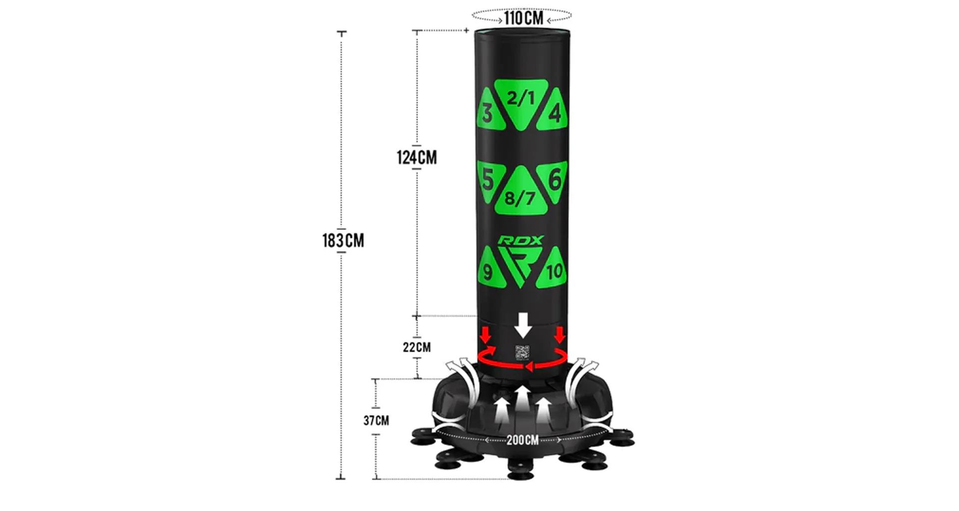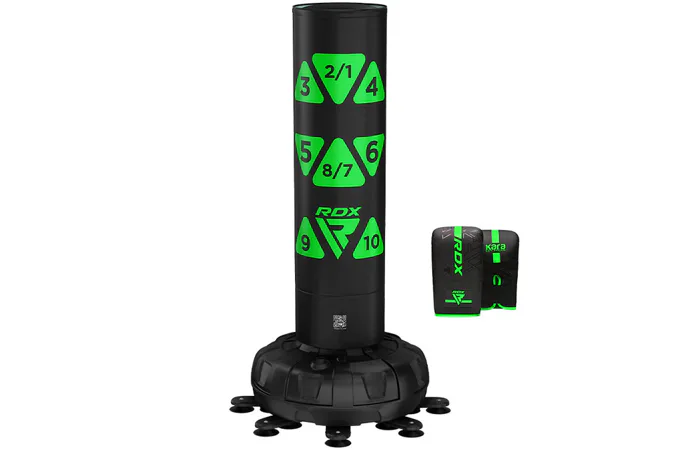 Voľne stojace boxovacie vrece RDX KT Ronin vo výhodnom sete s boxovacími rukavicami RDX je vysoko kvalitná tréningová pomôcka navrhnutá pre efektívne a všestranné cvičenie bojových športov i fitness. Toto inovatívne stojacie boxovacie vrece je vybavené odolným materiálom a robustnou konštrukciou, vďaka ktorej zostáva pevne na mieste aj pri intenzívnych úderoch a kopoch. Ideálne je pre boxerov, kickboxerov aj ostatných bojovníkov, ktorí hľadajú možnosť rozvíjať svoje zručnosti priamo doma alebo vo svojej telocvični.