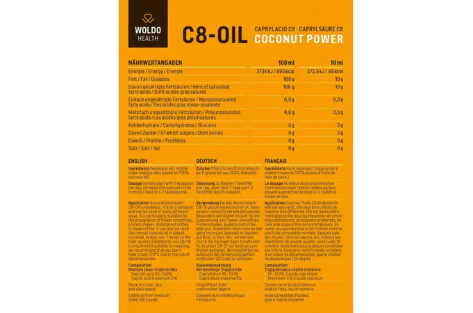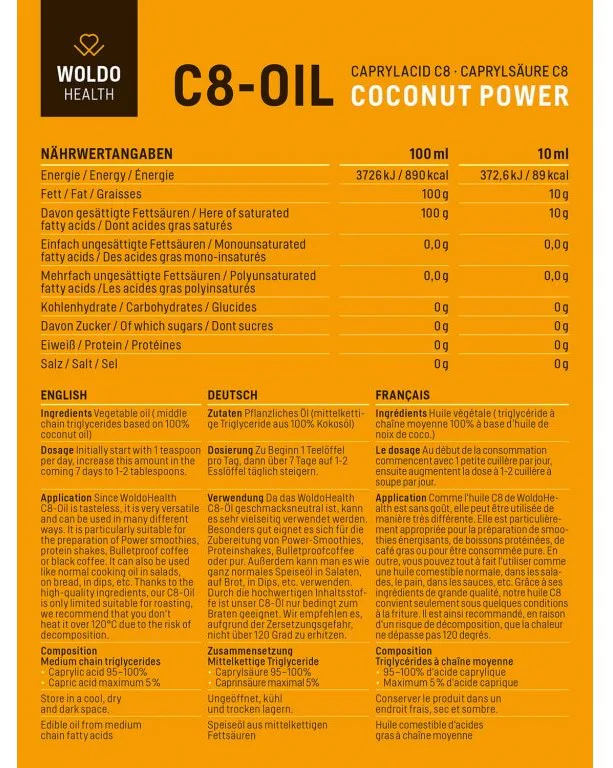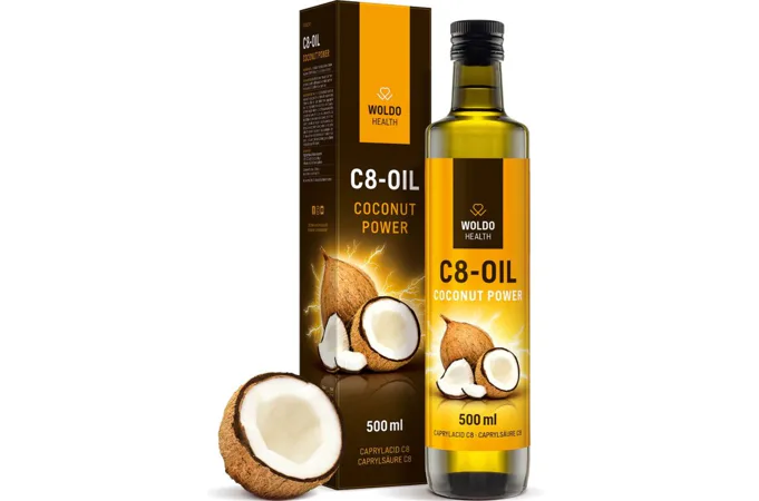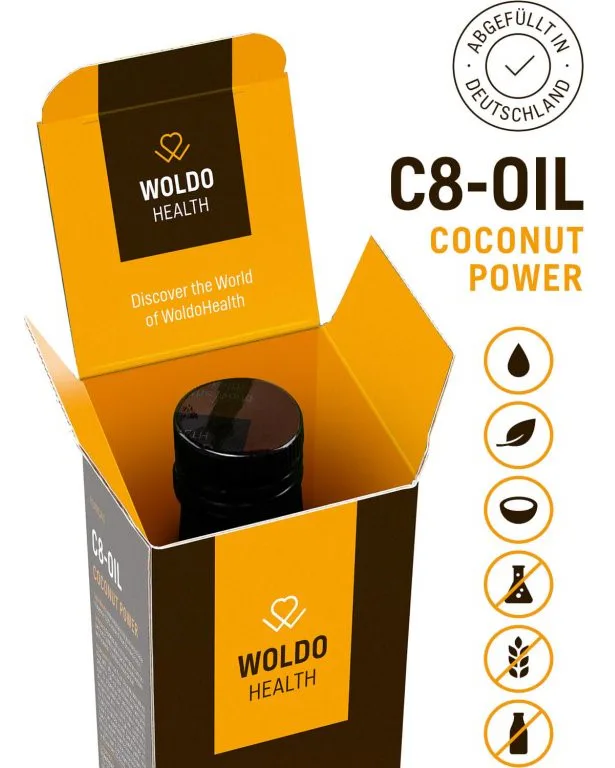 WoldoHealth® Kokosový olej MCT je číry, bez zápachu a bez chuti. Obsahuje tuk MCT C8 vysokej kvality (triglyceridy so stredným reťazcom) pre efektívny zdroj energie.