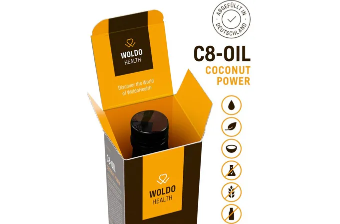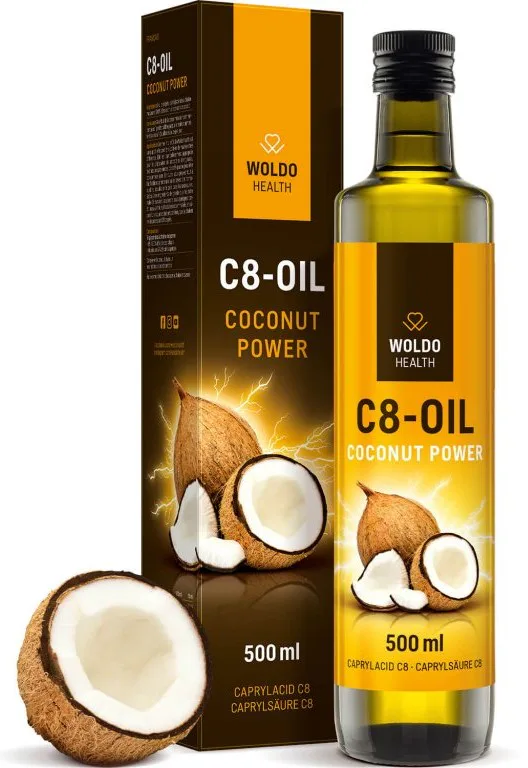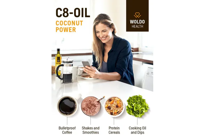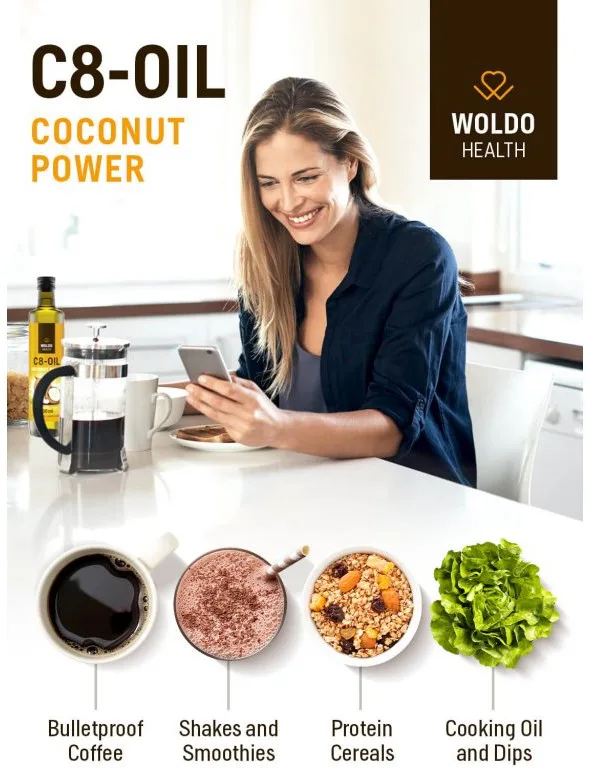 WoldoHealth® Kokosový olej MCT C8 je čistá Kyselina kaprylová z kokosového oleja s čistotou viac ako 99%. Vhodný pre nepriestrelnú kávu (Buletproof Coffee), alebo ako potravinový doplnok pre ketogénne a paleo diéty.