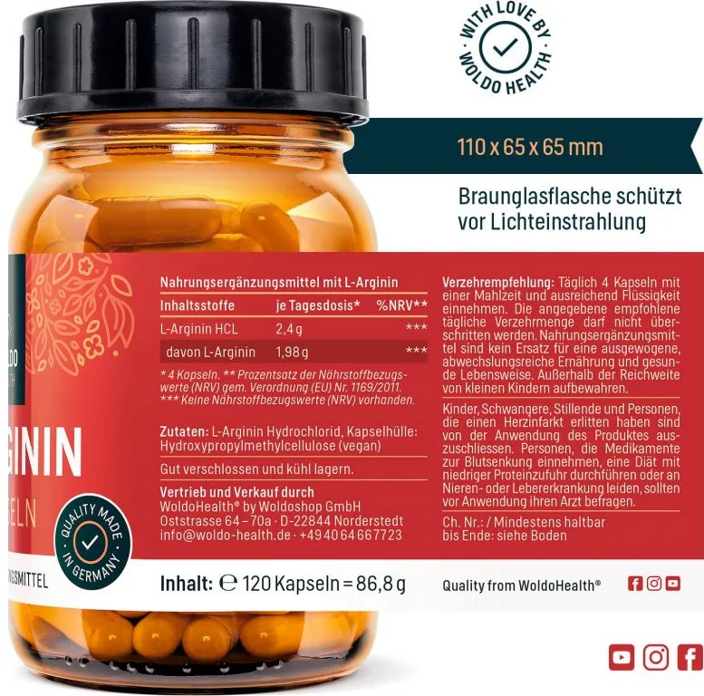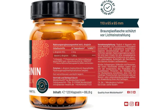 Woldohealth vysoko koncentrovaný 100% L-arginín HCL, s obsahom L-arginínu 82,7%. Má významný vplyv na kardiovaskulárny systém. L-arginín HCL viaže aminokyselinu na chlorovodík, ktorý neutralizuje horkú chuť L-arginínu, napomáha k lepšiemu vstrebávaniu ľudským telom a dodá telu L-arginín čisto prirodzenou cestou. V jednej dennej dávke (4 kapsule) získate 2,4 g L-arginínu HCL (2400 mg) a z toho 1,98 g (1980 mg) L-arginínu.