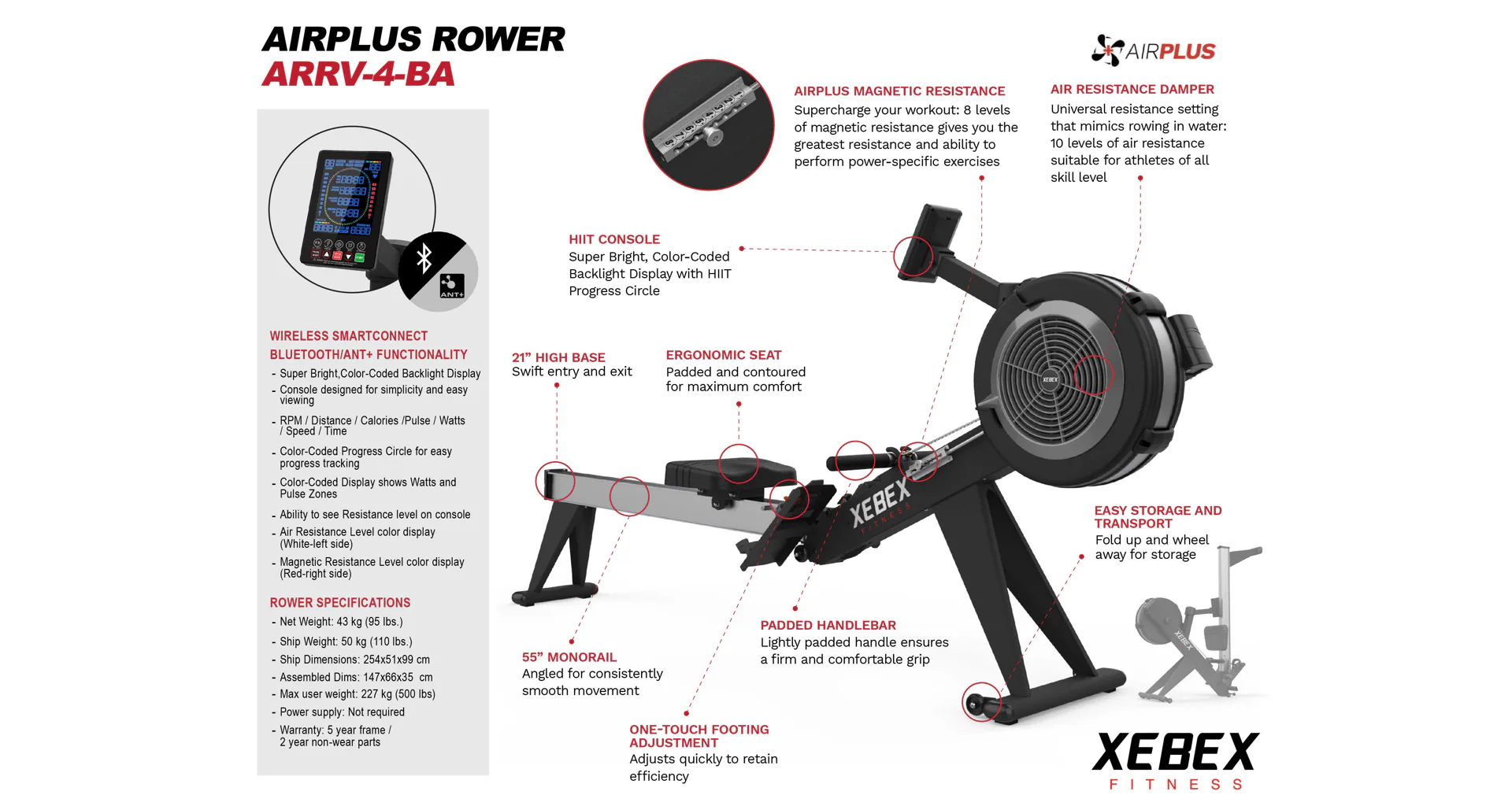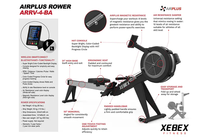 XEBEX Air Rower 4.0 Smart Connect patří ke špičkovým, komerčním veslovacím trenažérům s dlouholetou tradicí. Tento model nabízí to nejlepší, co si můžete pro domácí, ale i plně komerční veslování přát, a to zejména v oblasti prvotřídní kvality, robusní konstrukce, komfortu veslování i inovativního designu.