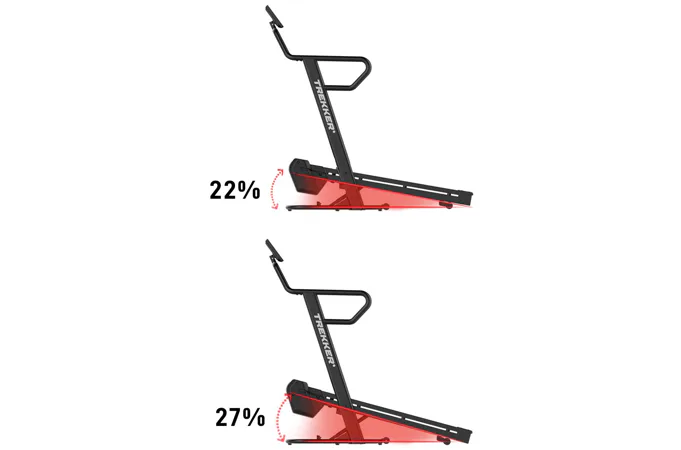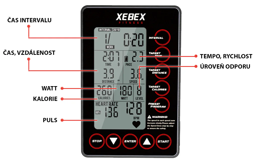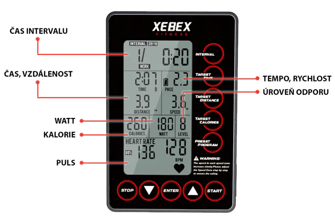 Maximální rychlost pásu XEBEX Trekker 4000 je až 6 km/h, při sklonu 22 nebo 27% jde o více než solidní tempo, které nám pás umožňuje zařadit a můžeme tak simulovat velmi náročnou chůzi po horských oblastech.