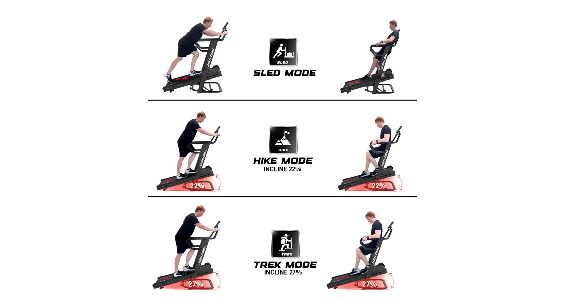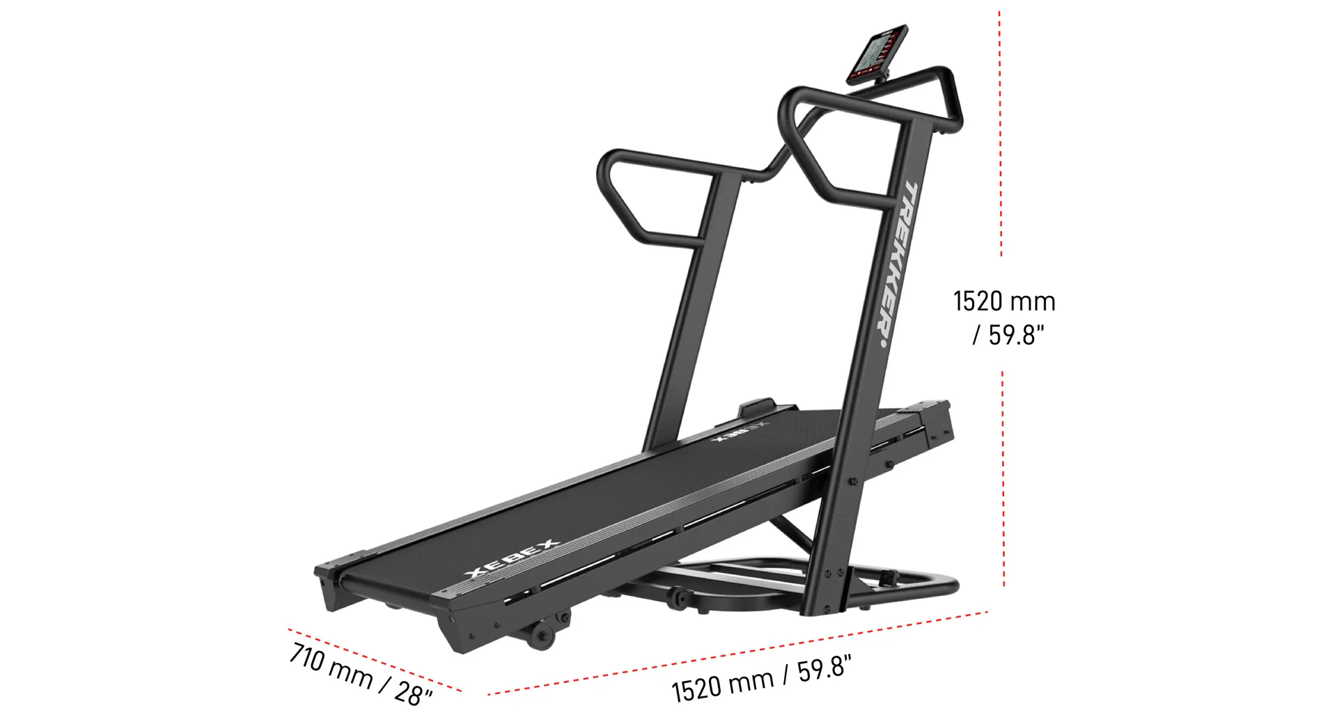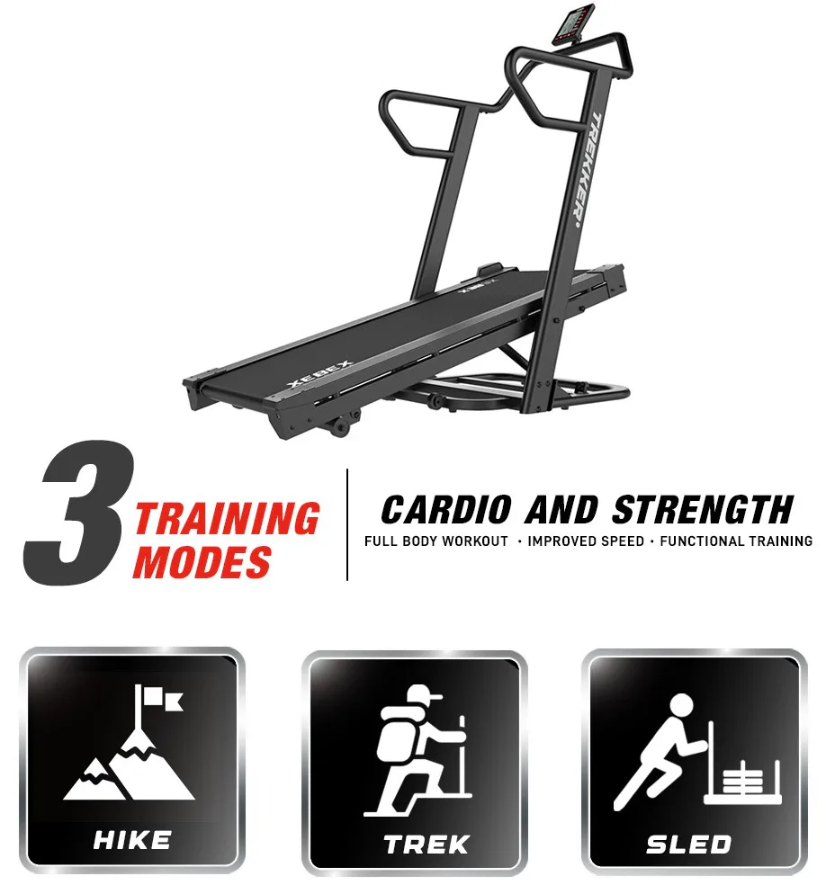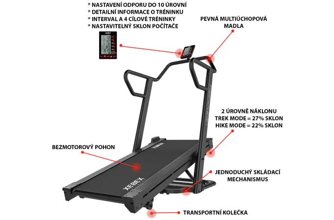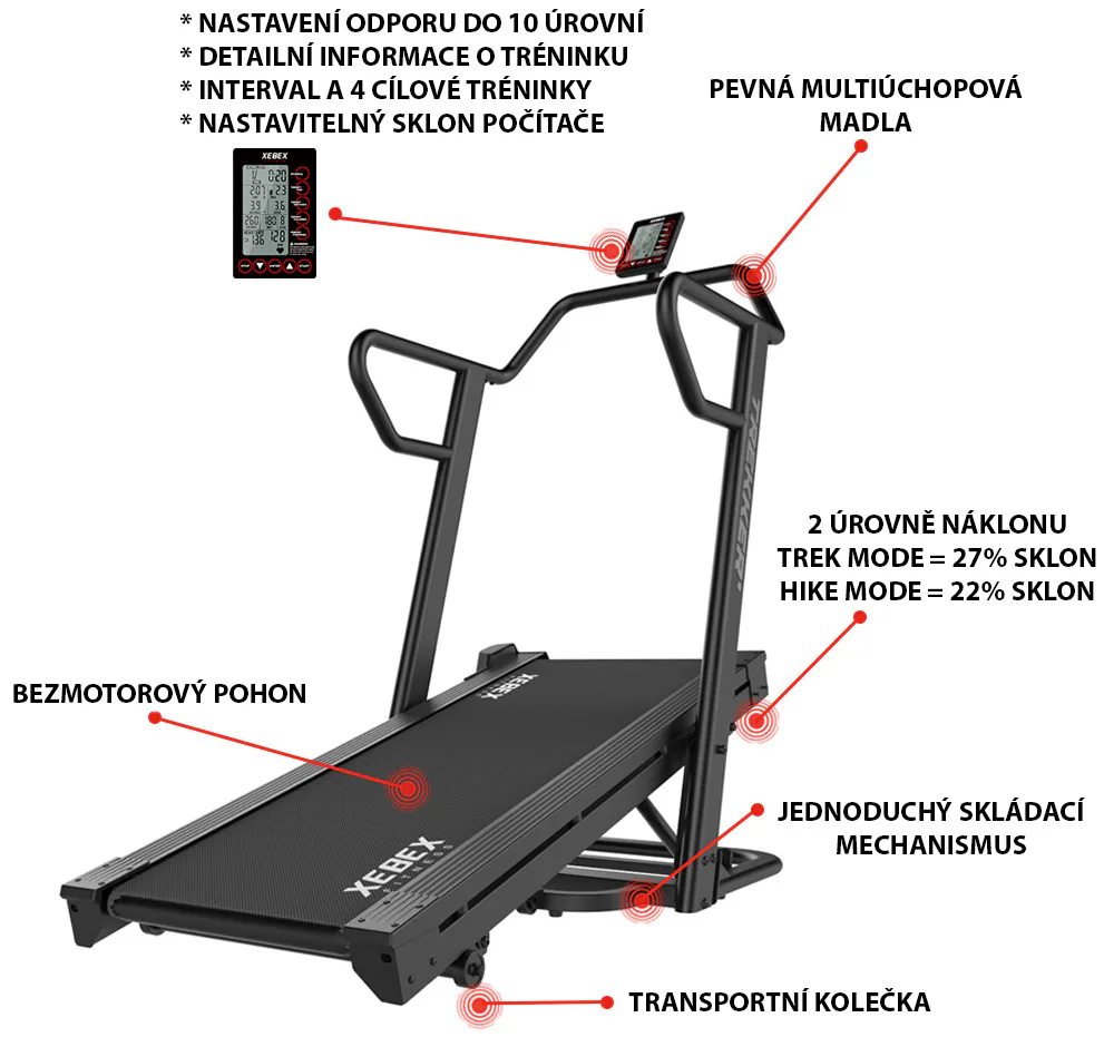 XEBEX Trekker 4000 je běžecký pás pro opravdu náročné zákazníky, který je poháněn samotným běžcem a navíc tvoří odpor pomocí generátoru. Předností XEBEX Trekker 4000 je možnost sklonu do 22 a 27% úhlu a generátor, který tvoří odpor a zároveň napájí počítač. Díky tomu můžete perfektně simulovat náročnou horskou turistiku, chůzi do kopce, či tlačení saní.