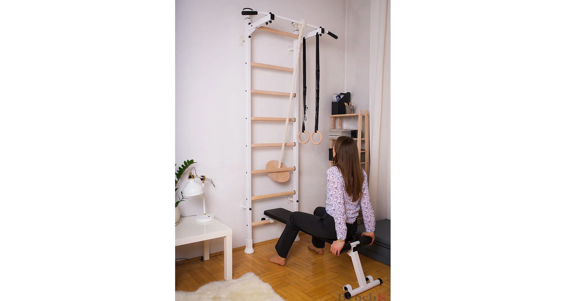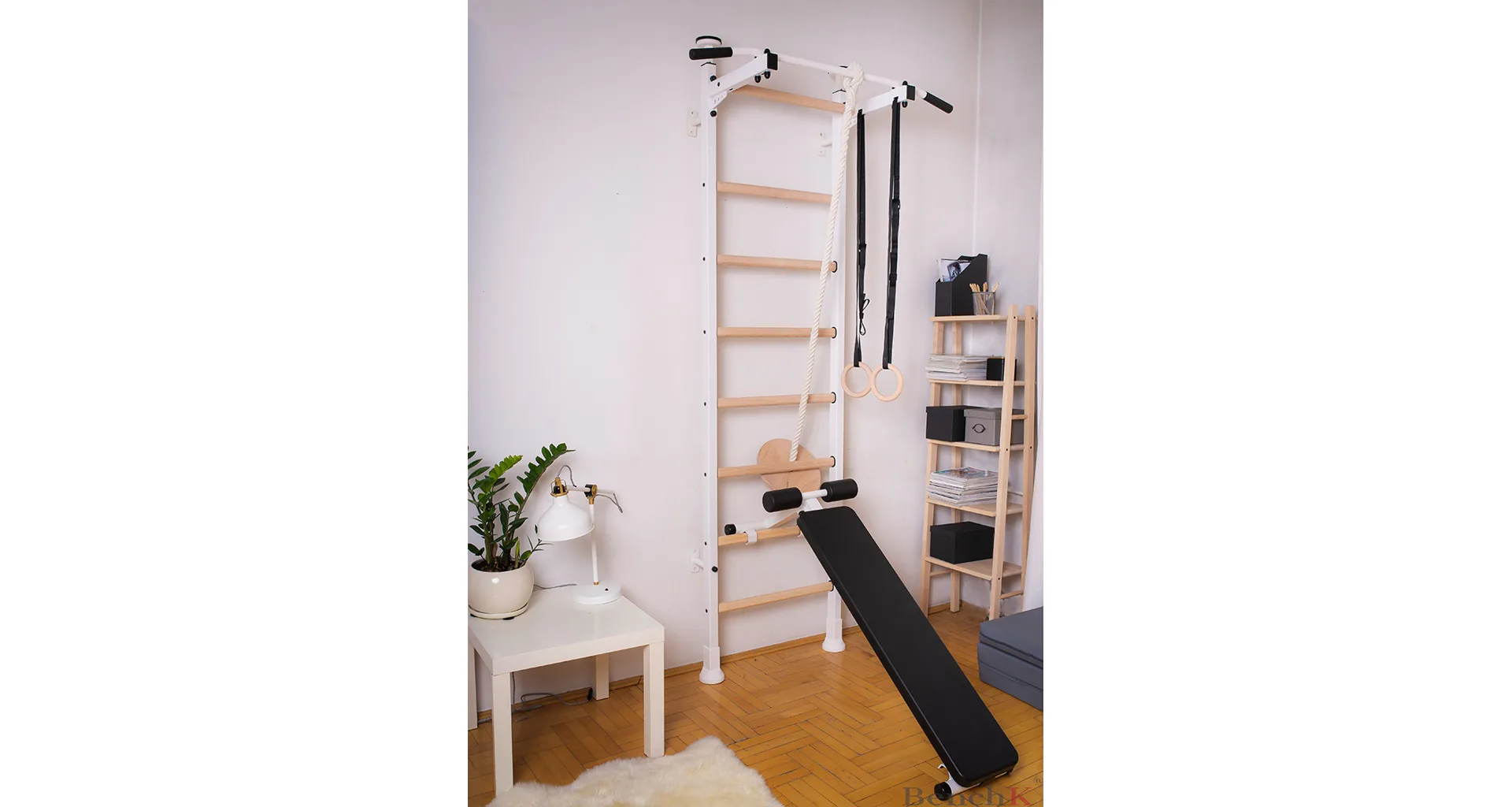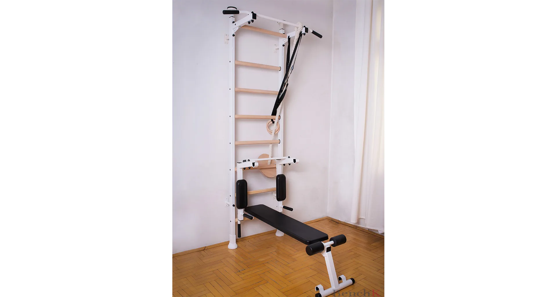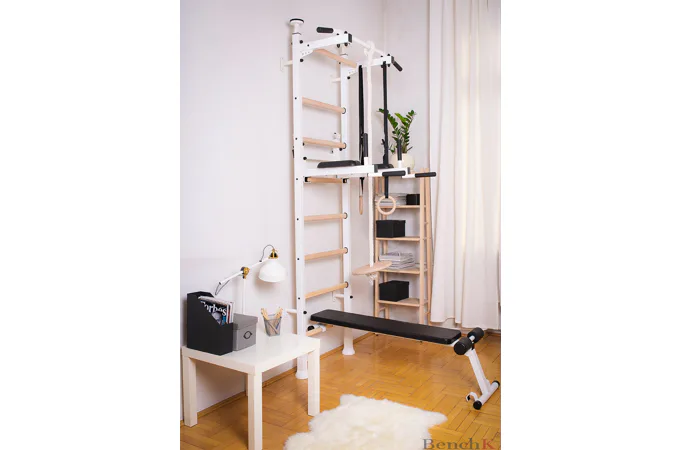 Závesná lavička BenchK B4 je vhodná pre rebriny BenchK 412. Kvalitné čalúnenie z polyuretánu zaručuje pohodlie a dlhú životnosť. Kovová rámová konštrukcia má bielu matnú farbu.