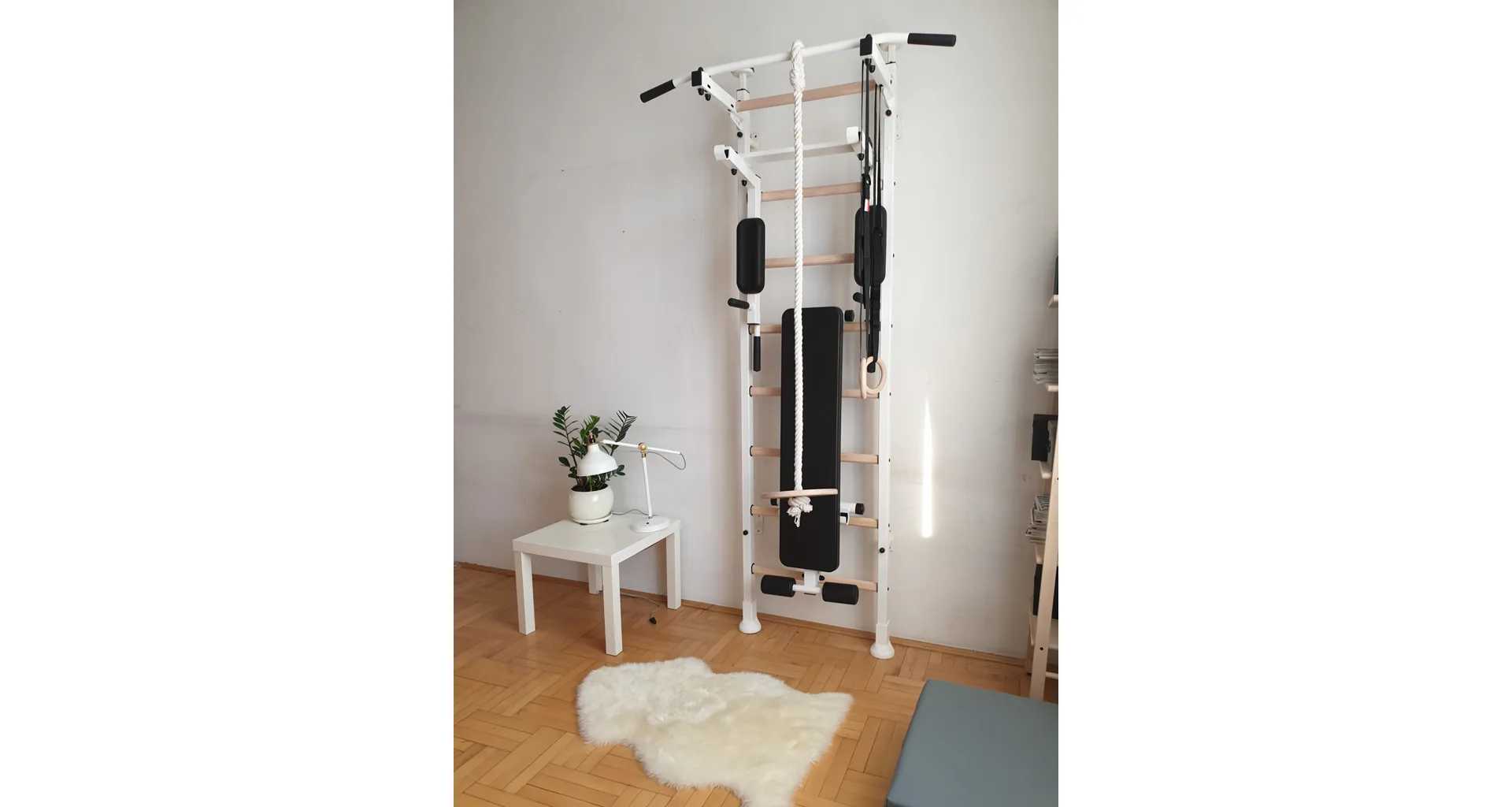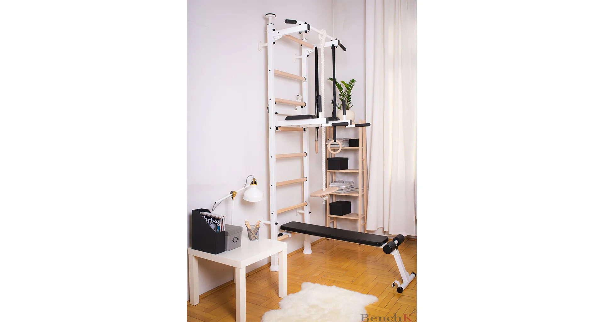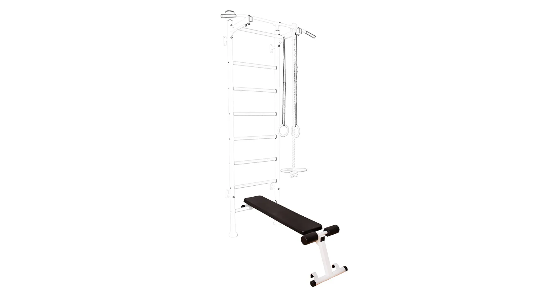 Závesná lavička BenchK B4 je vhodná pre rebriny BenchK 412. Kvalitné čalúnenie z polyuretánu zaručuje pohodlie a dlhú životnosť. Kovová rámová konštrukcia má bielu matnú farbu.