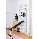 Závesná lavica BenchK biela B3 je vhodná pre rebriny BenchK 310W. Súčasťou lavice je chrbtová opierka, prídavné sedadlo a štyri oporné valce pre nohy. Kvalitné čalúnenie z polyuretánu zaručuje pohodlie a dlhú životnosť. Kovová rámová konštrukcia má čiernu matnú farbu a je vyrobená z profilu 50 x 40 mm s hrúbkou 2 mm.
