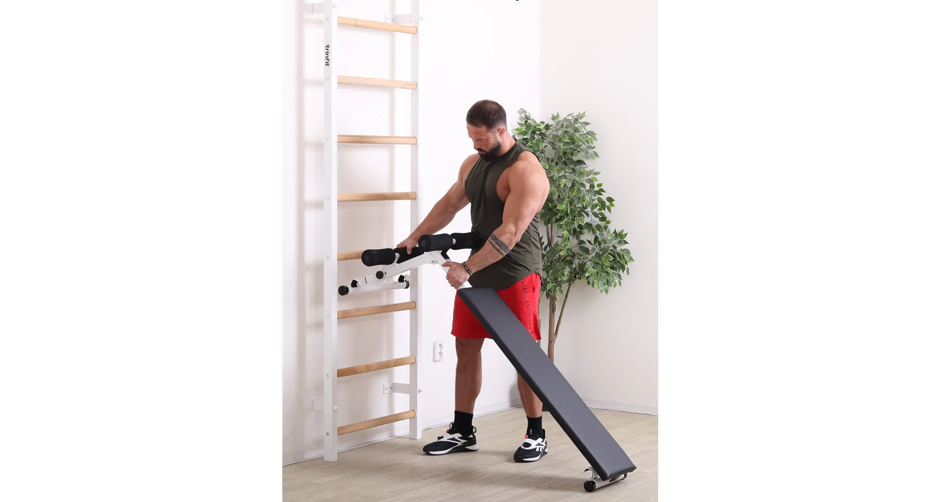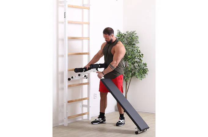 Závesná lavica TRINFIT Elegance ponúka unikátnu výhodu variabilného zavesenia do rôznych uhlov vďaka tomu, že ju môžete ľahko upevniť na rôznych priečkach rebrín. To vám umožňuje prispôsobiť náklon lavice podľa typu cvičenia a intenzity, ktorú preferujete.