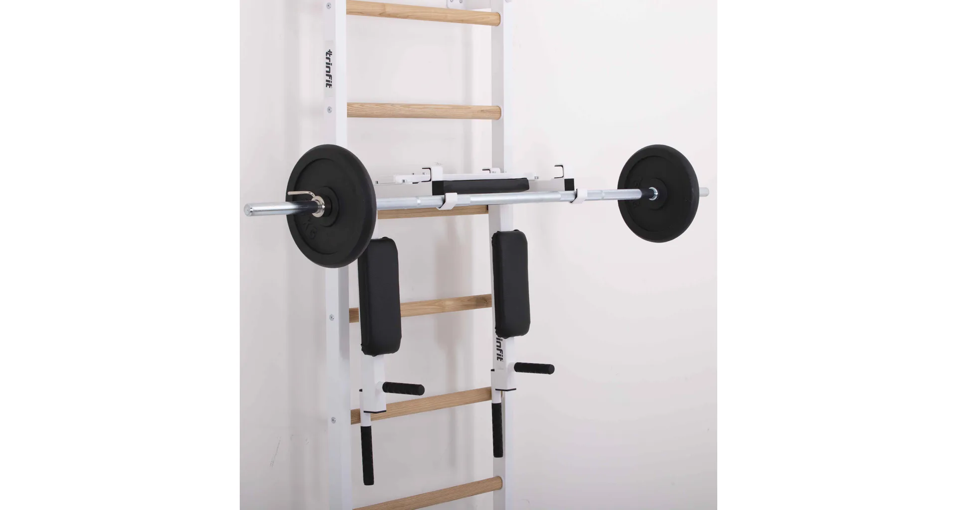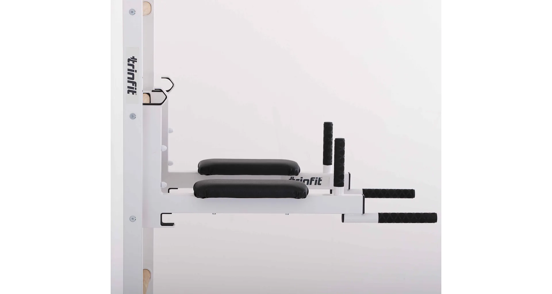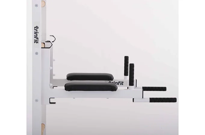 Ďalšou významnou výhodou týchto bradiel je ich funkcia stojana na veľkú os. Pri zavesení bradiel na špeciálne závesné háky sa z nich stáva praktický stojan na činku, ktorý v kombinácii so závesnou lavicou TRINFIT Elegance umožňuje vykonávať cviky, ako je bench press alebo tlaky na ramená s veľkou osou. Po dokončení série môžete činku bezpečne a pohodlne odložiť do držiakov na os, čo prináša vyššiu bezpečnosť a komfort pri cvičení. Tento multifunkčný design výrazne rozširuje možnosti tréningu, a to všetko s minimálnymi nárokmi na priestor.